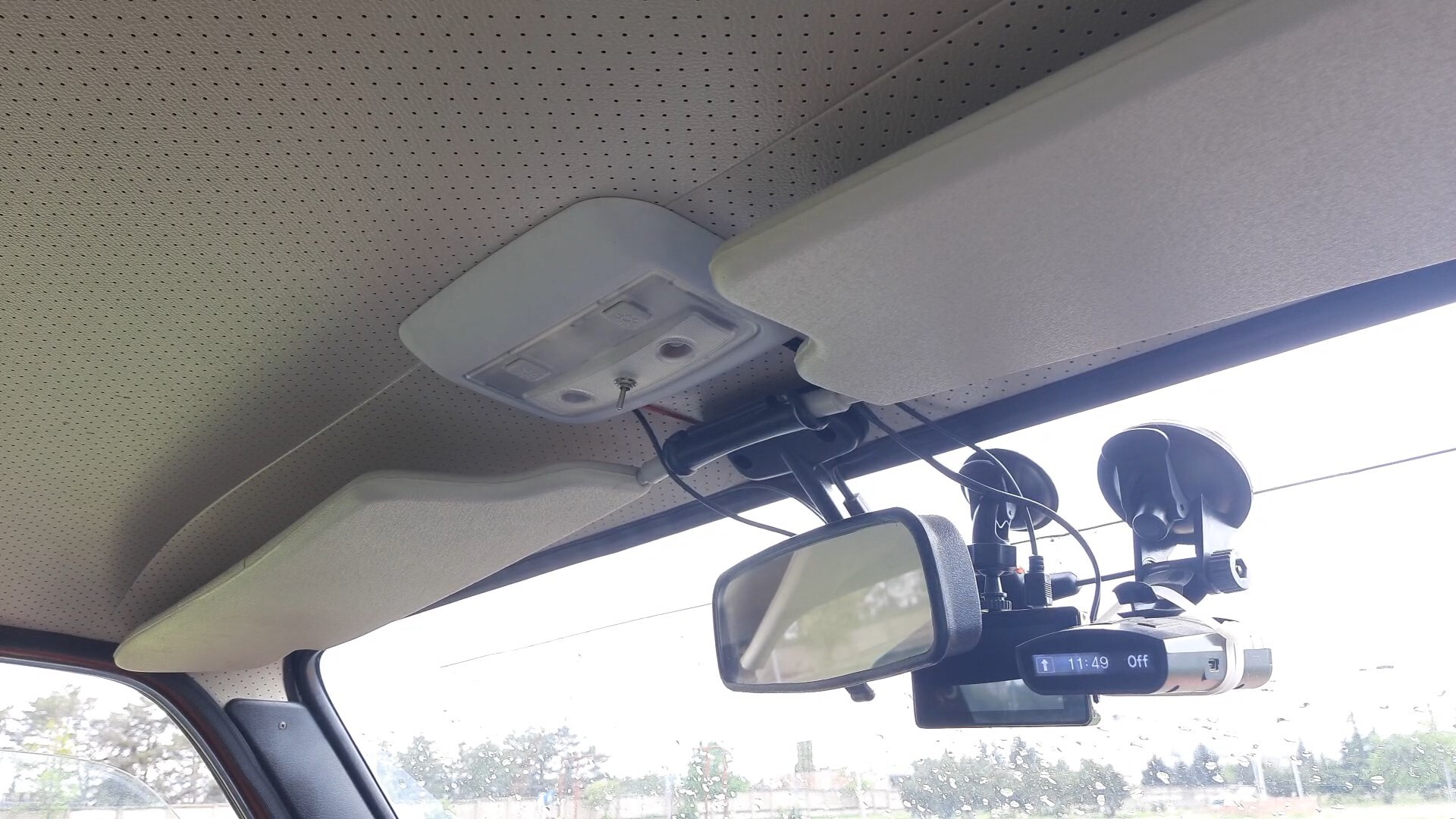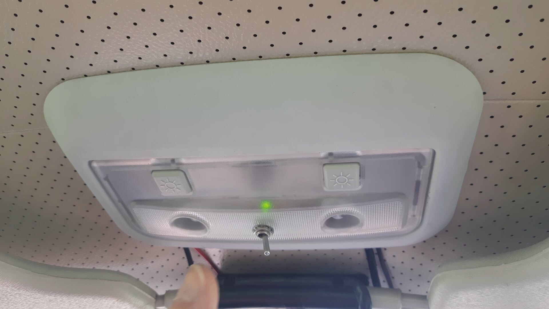 5. Установлен видеорегистратор с тумблером принудительного включения. Чтобы спрятать провод от видеорегистратора и не занимать им прикуриватель, я протащил плюсовой провод от зажигания к потолочному светильнику. На светильнике уже есть постоянный плюс питания и масса. Под этим же светильником был спрятан преобразователь питания 12 В – 5 В для питания видеорегистратора.