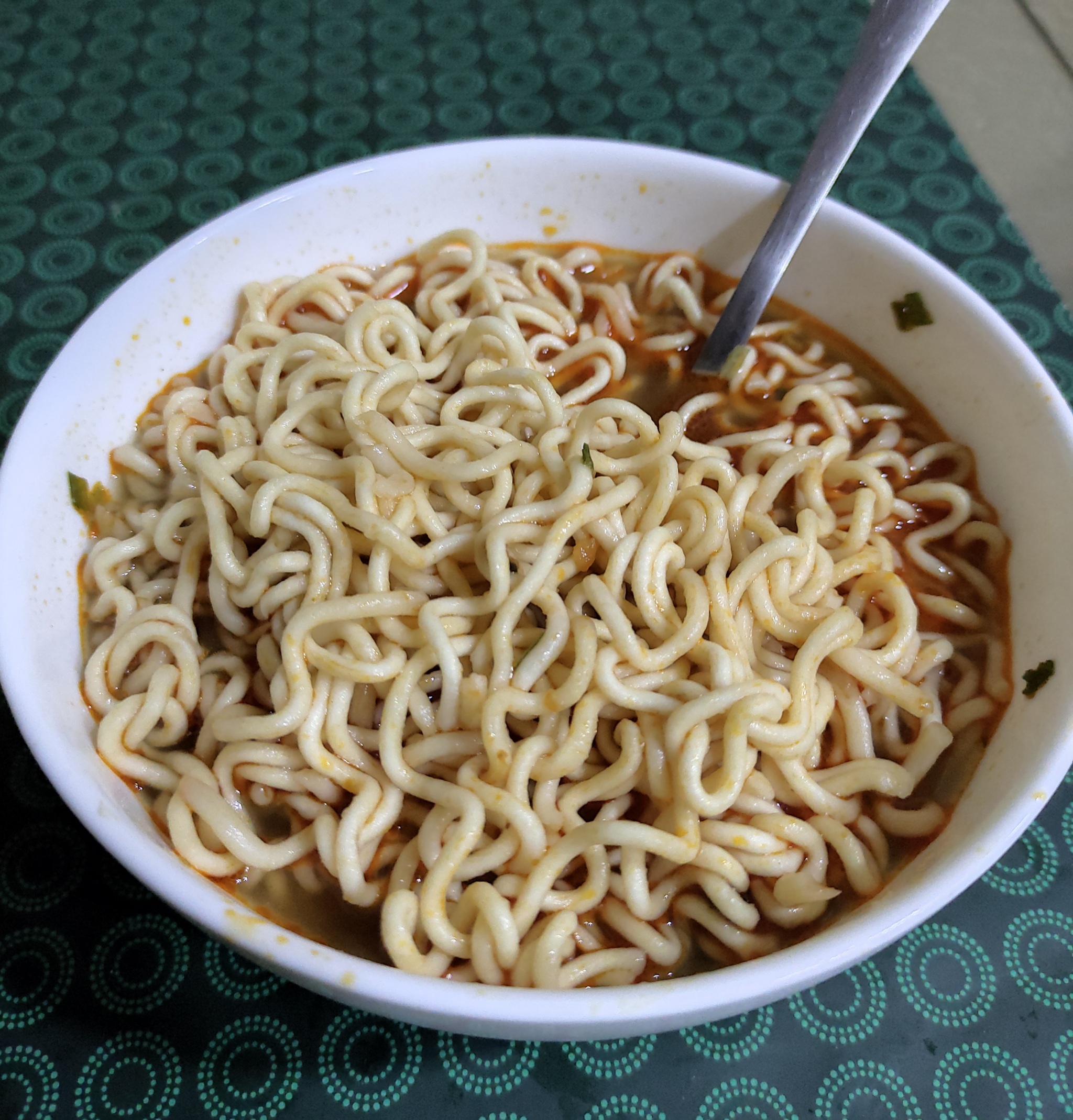 Лапша получилась весьма добротной. Сама лапша крупная, без каких-то привкусов. Суповая основа и соус вместе напоминают немного красный доширак, но все-таки вкус интереснее (более пряный) и насыщеннее. Лапша получается слегка острая, но все-таки мягче, чем красный дошик. Мясной вкус интересный, совсем не похож на тот самый однообразный и убогий "мясной вкус" из всякой дешевой лапши.