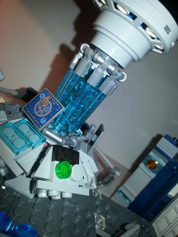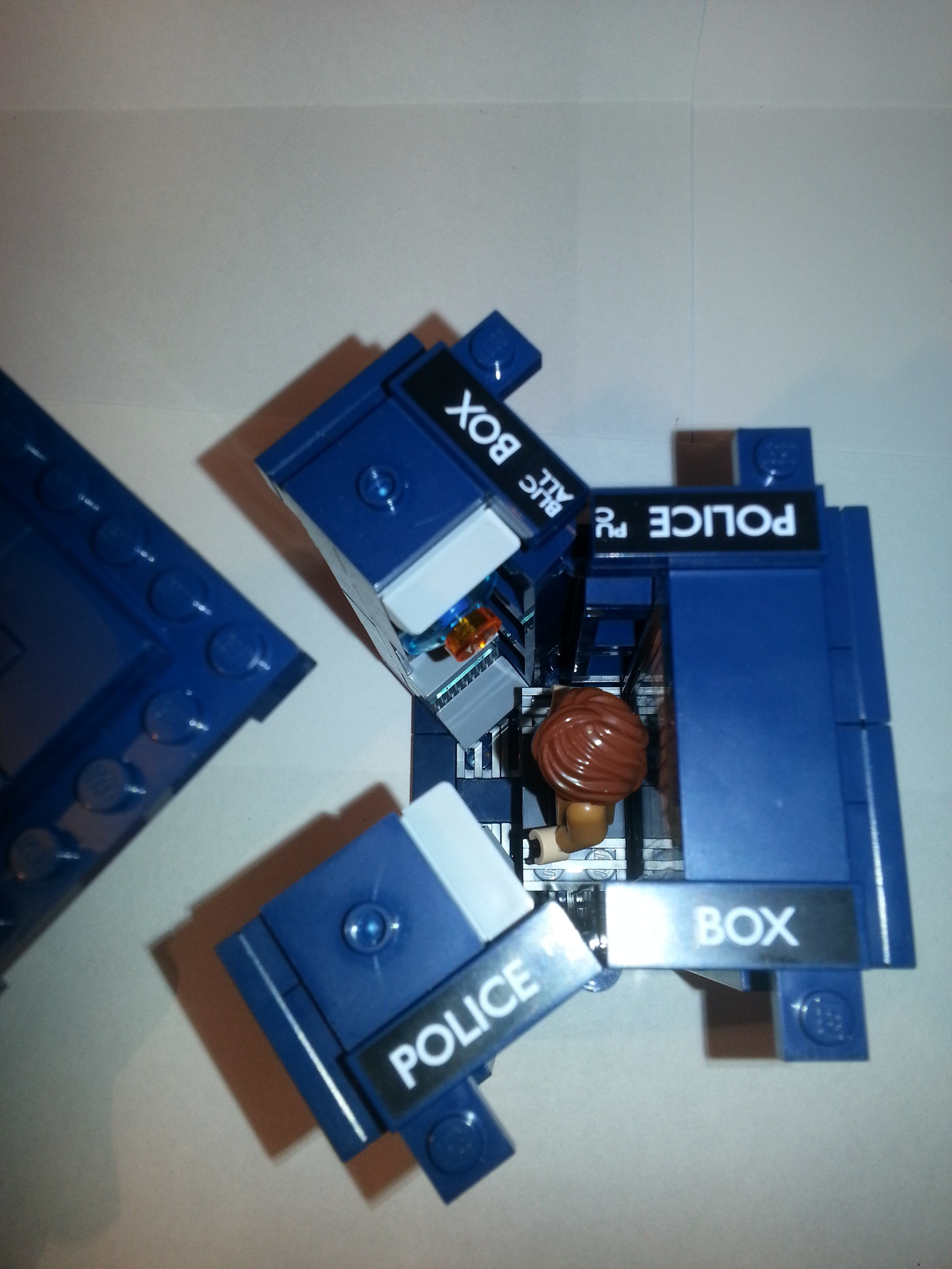 Внешняя часть ТАРДИС присоединяется вот такой палочкой. Выглядит не очень надёжно, но держится отлично. И теперь действительно понятно, что она больше внутри чем снаружи) Даже в каком то ролике разрабы говорили мол проектировали набор так, что бы им могли играть одной рукой.