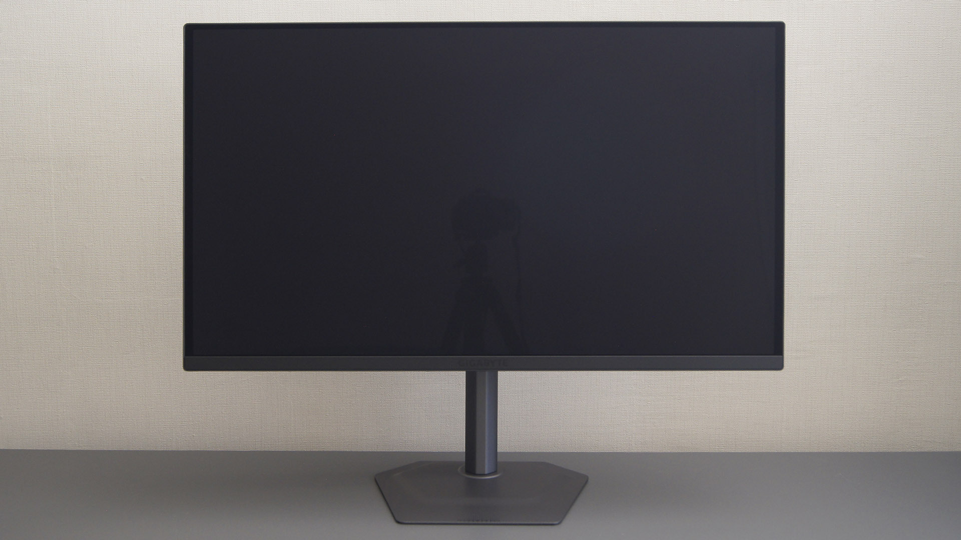 Штатная подставка окрашена в темно-серый цвет – такой же, как и «чехол» матрицы. Основание (нога) подставки плоское и хоть и занимает пространство на рабочем столе, но из-за плоской формы позволяет сверху смело класть клавиатуру и по сути не съедает пространство. Сама же сборка конструкции интуитивно понятна. Стойка и основание выполнены из металла и соединяются одним винтом, который закручивается вручную.