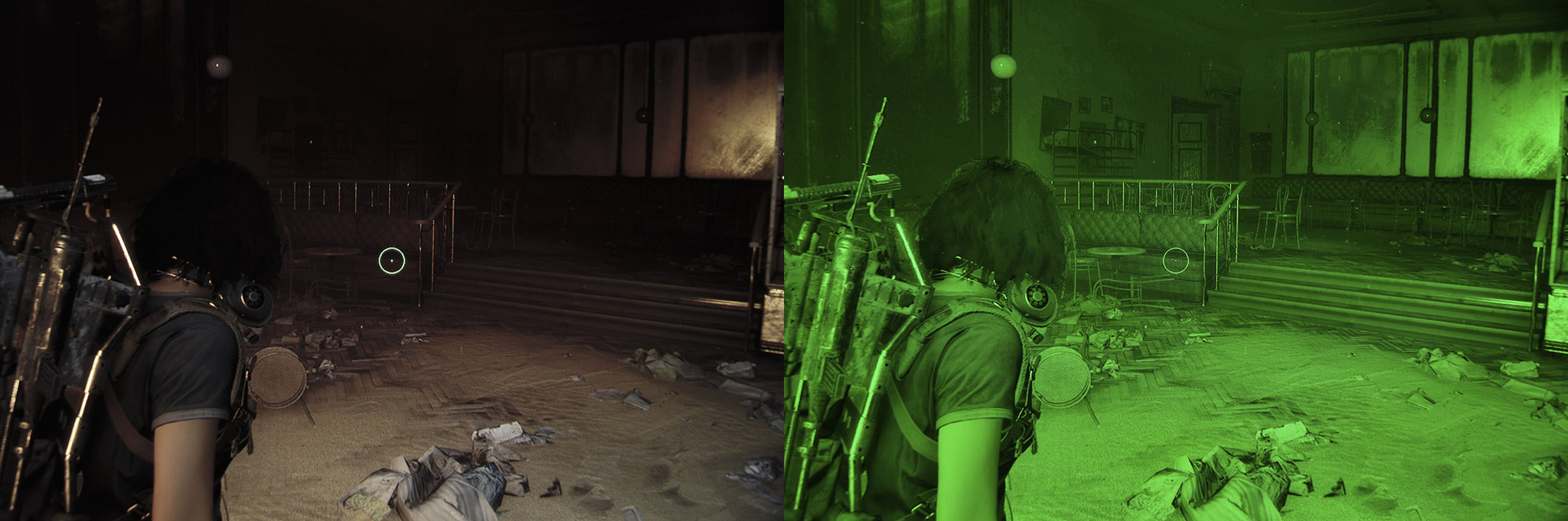 Night Vision. Своеобразный режим ночного видения. Картинка выглядит специфически, но темные участки становятся различимыми.