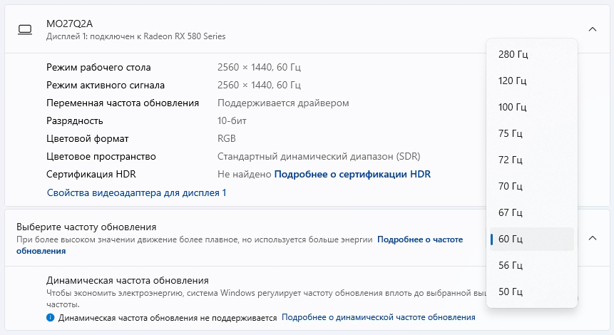 Перед тем как разбирать OSD-меню монитора, взглянем на параметры в системе. Windows определяет панель как 10-битную. Базовый набор частот обновления включает диапазон от  50 Гц до 280 Гц.