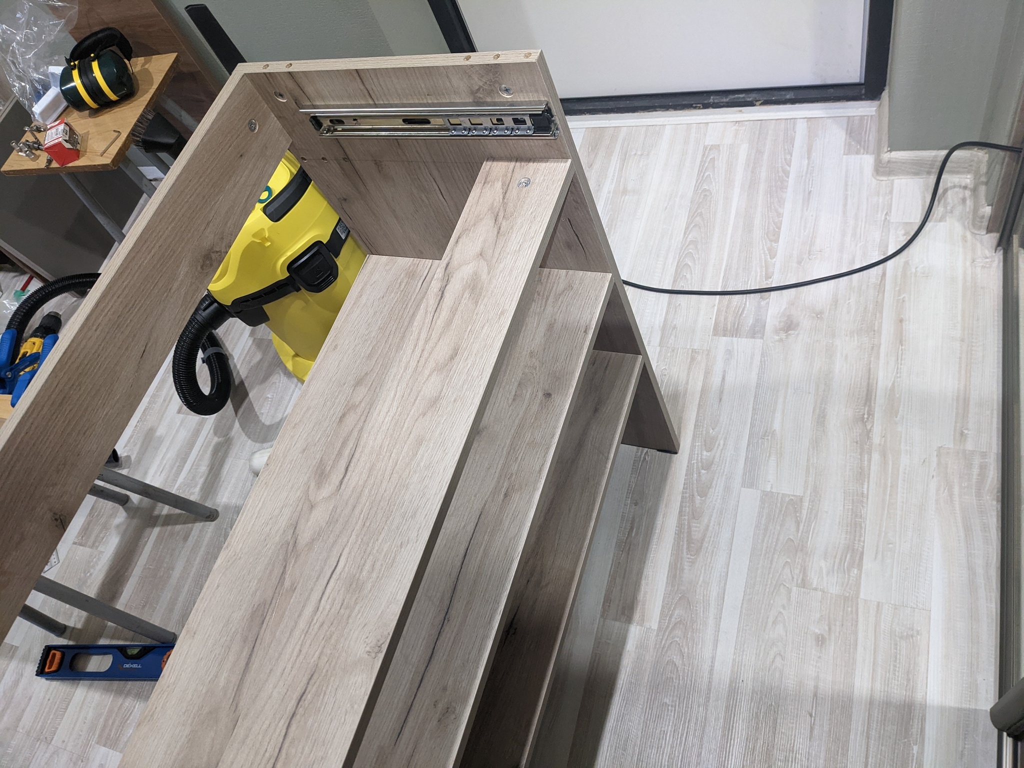 В целом мне понравилась идея HeARTwood покрыть стол гетинаксом, но он сложен в обработке, очень тяжело пилится, фрезеруется и шлифуется. Отверстие в упоре фрезеровал сам, спасибо HeARTwood, и его инструкциям, получилось очень красиво, но на фото не видно… В тумбе тоже осталось доделать фасады ящиков. Стружкоотсос подсоединяется в профиль упора сзади.