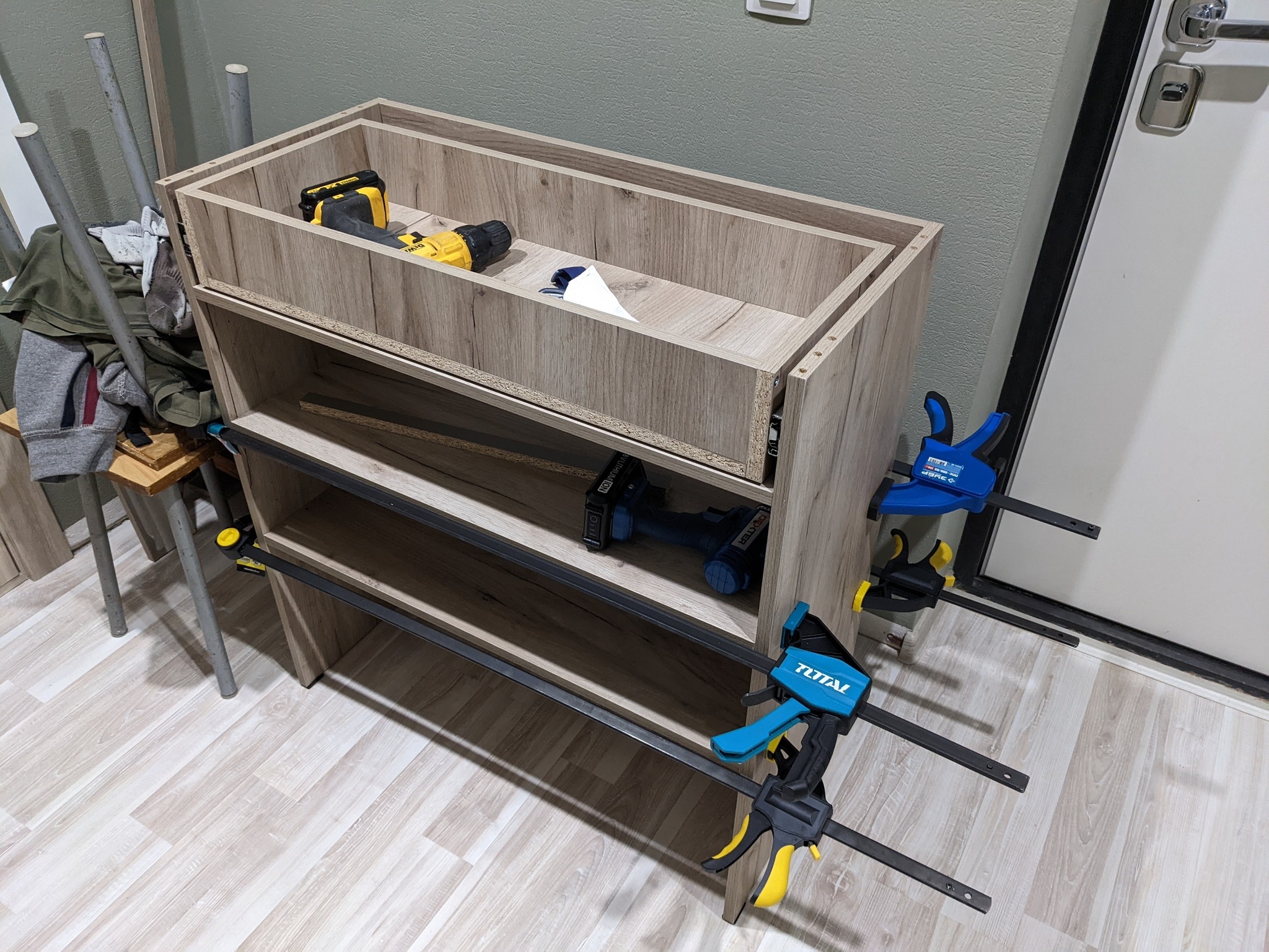 Рейсмус Dewalt DW735, по мне лучший в своем классе, но дорогой, изначально хотели Makita 2012, но он исчез из продажи, а ДР не отодвинешь))). Почти доделал для него тумбу, которую целиком подсмотрел тут. В тумбе еще осталось доделать фасады ящиков.
