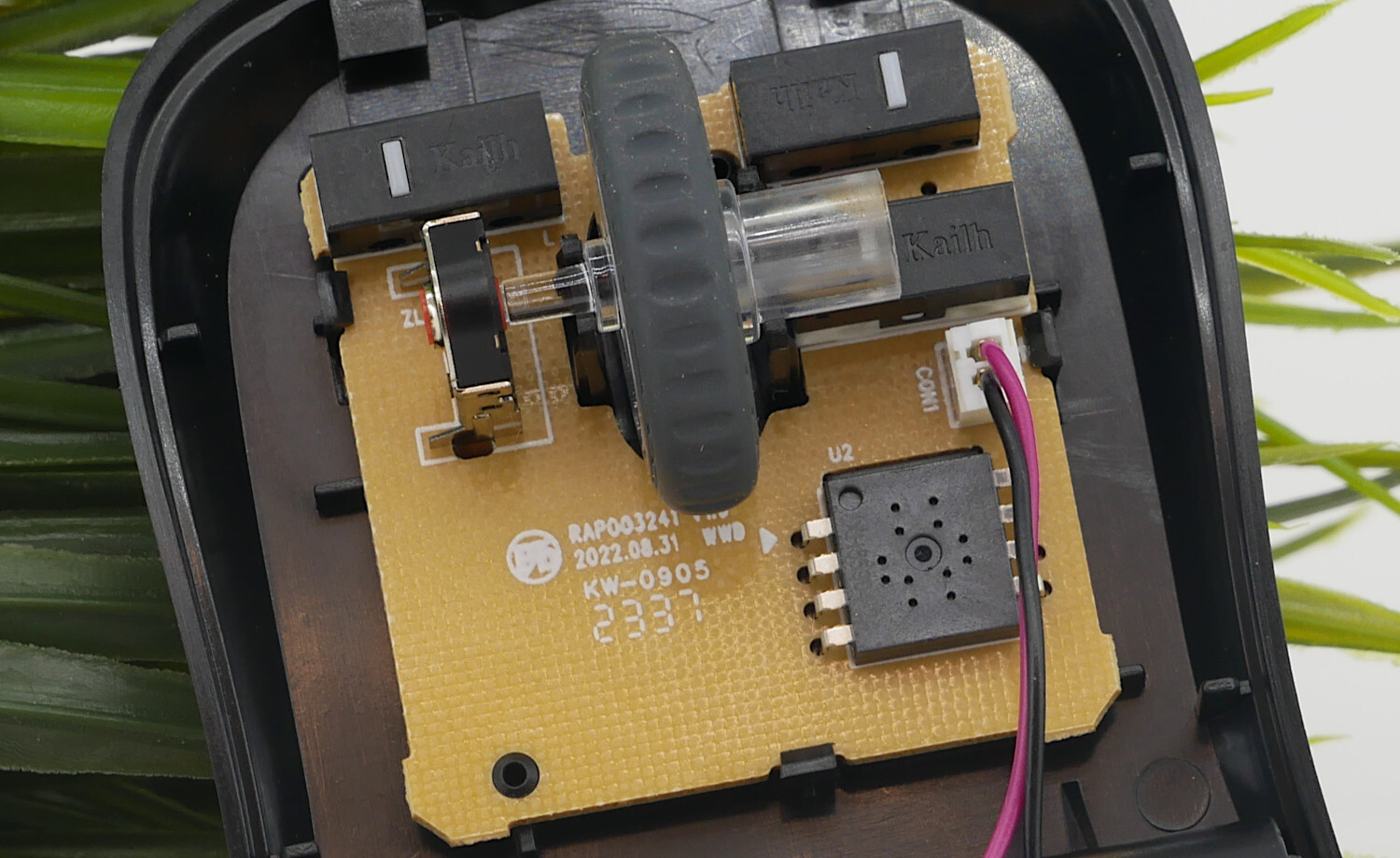 Внутри нас встречает точно такая же плата, как и на модели Rapoo M10 Plus: видим микросхему оптического сенсора, но маркировка почти нечитаема. Приятно радуют все три переключателя — это Kailh.