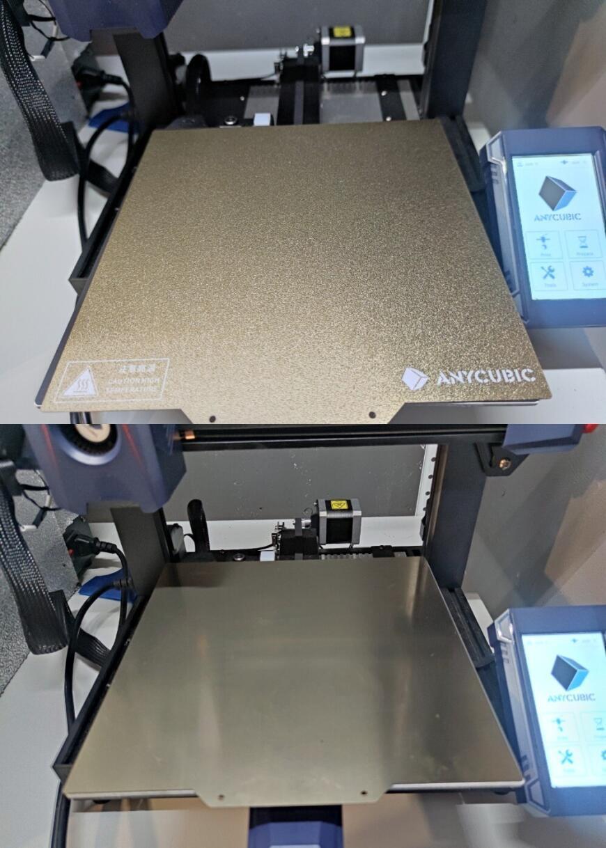 На столе Pei пластина. Отличное решение для Pla пластика, удобное и живучее. Адептам печати на стекле тут придется туго, так как датчик реагирует на металл, и стекло толще 2мм скорее всего не положить, да и надо ли? Пластина двухсторонняя, для глакой и фактурной поверхности дна модели.