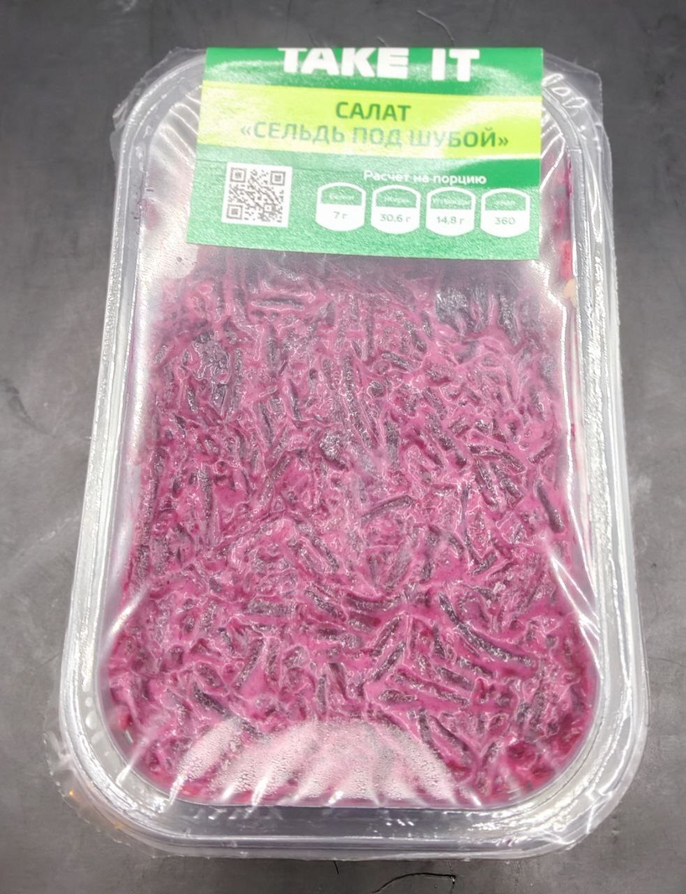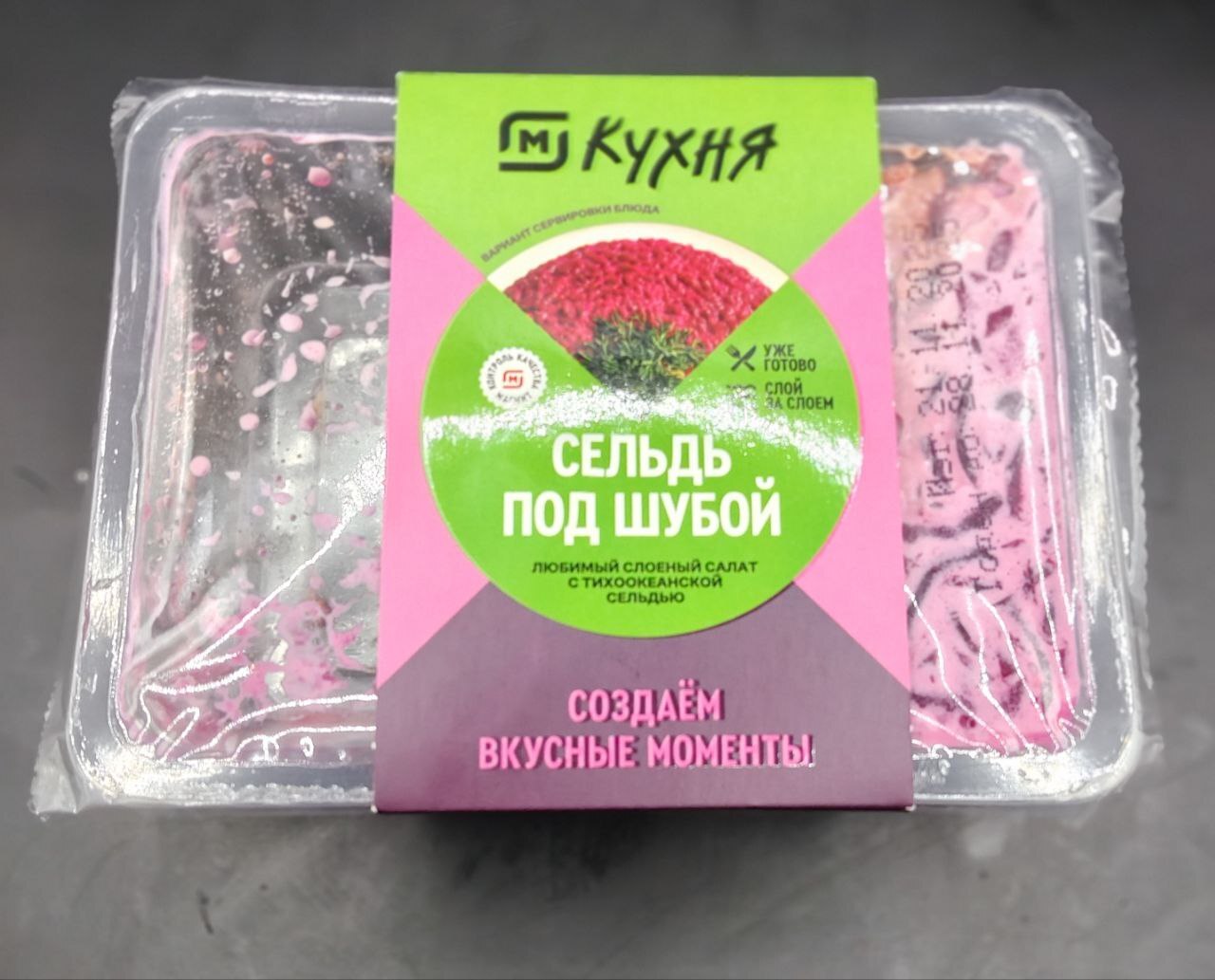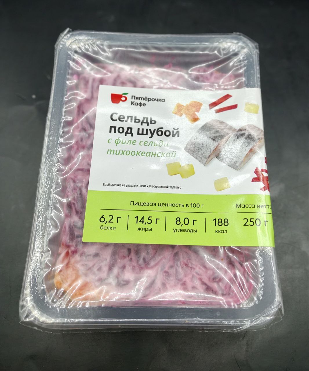 Здесь тоже чувствуется не вся комплектация салата, но непривычный калибр свёклы придаёт салату изюминку, сельдь нарезана небольшими кусочками, а сам салат плотно занимает весь контейнер, а не катается по нему из стороны в сторону как в "Магните". Это не классическая сельдь под шубой, но вполне хороший салат.