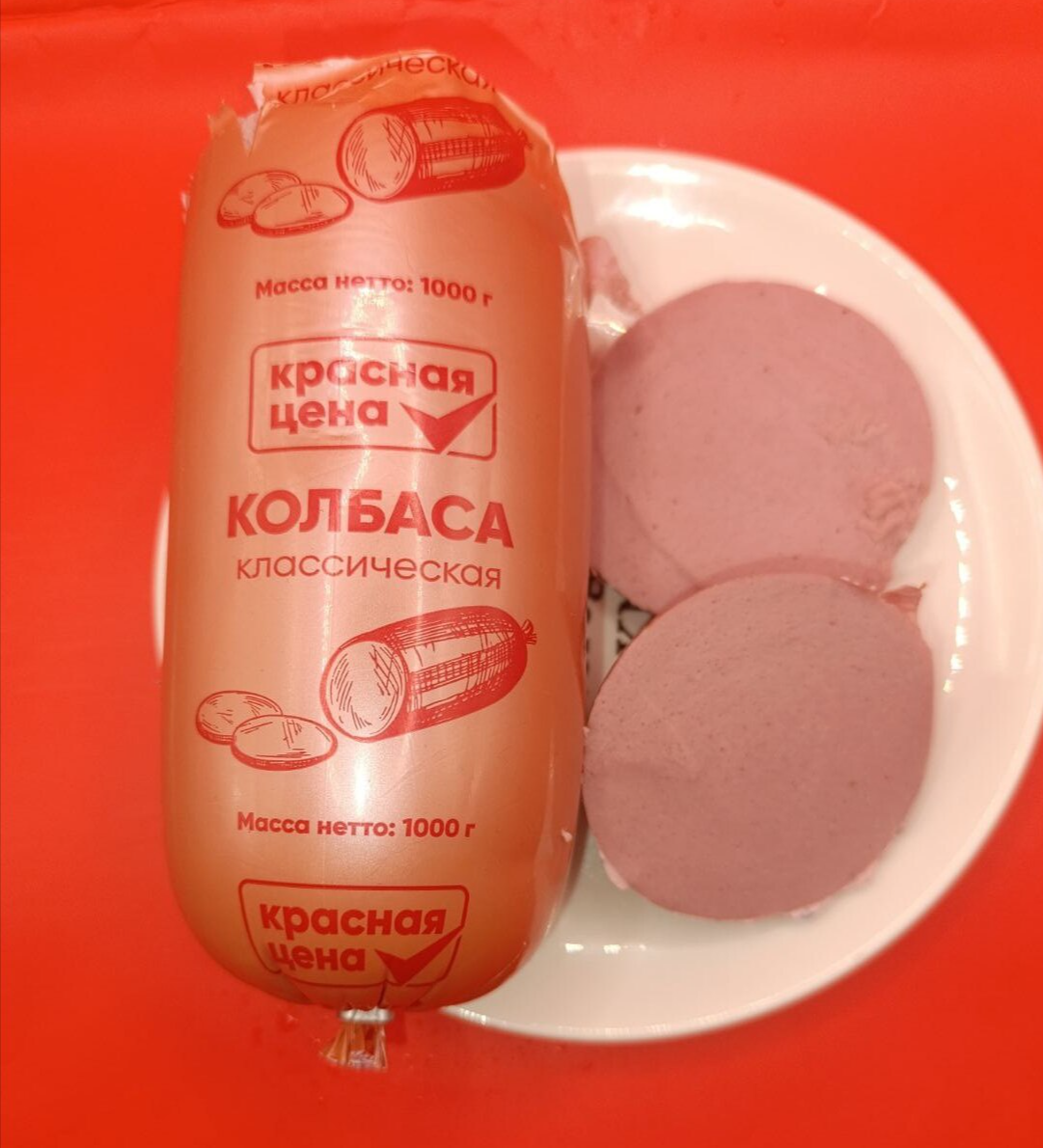 Нет, это не опечатка, а пугающая реальность. Килограмм колбасы за 110 рублей! Производит это чудо природы мясокомбинат "Атяшевский", кто смотрит обзоры Грилькова, тот с эти МПК знаком, это всегда дешёвые продукты очень плохого качества. Ну что ж, проверим. Запах не противный, но и не мясной, в основном приправы и добавки, на упаковке написано что это мясосодержащий продукт! В составе идет свинина, вода, курица механической обвалки... А знаете что, это не ужасно, но плохо, сама колбаса плотная, не разваливается, вкус множества добавок, то есть дешёвой мясосодержащей "колбасы". Кусочек можно доесть (ниже будут экземпляры похуже), но покупать это не стоит.