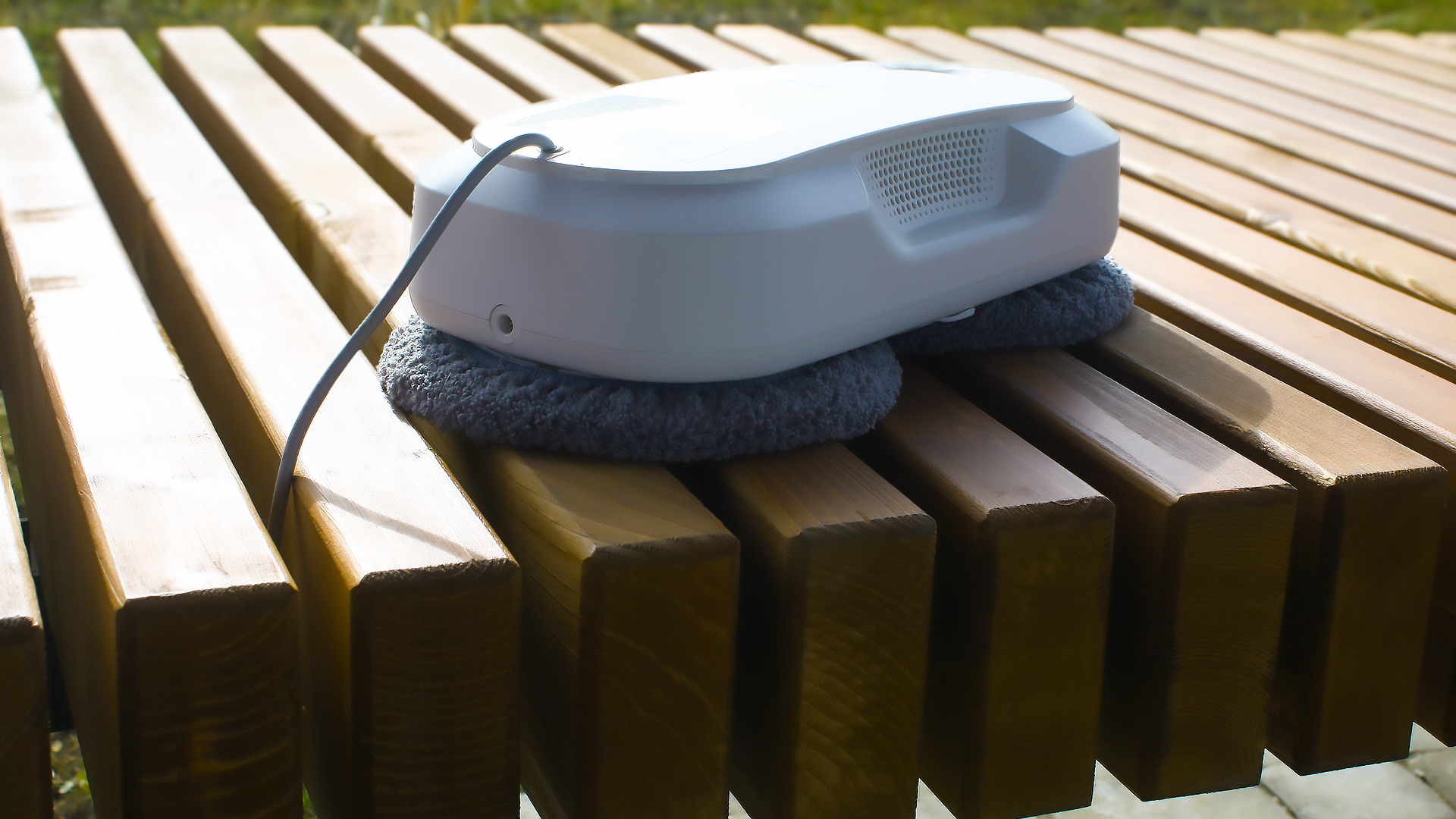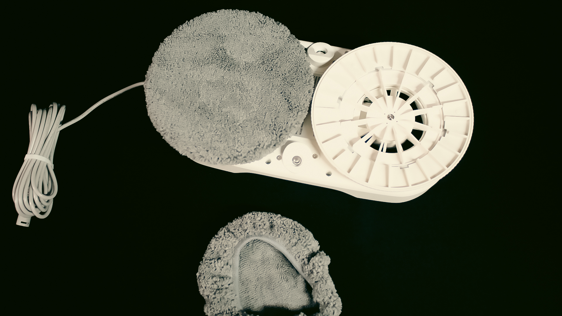 На нижней части корпуса робота расположены быстросъемные диски. На них надеваются салфетки (идут в комплекте). Под дисками расположены каналы вакуумного насоса. Именно благодаря им и создается эффект «прилипания» робота к плоским поверхностям (не важно, окно это или дверь). Двигатель, мощностью 72 Вт способен обеспечить работу вакуумного насоса, который в свою очередь создает огромную силу всасывания, равную 3000 ПА. Для подобных компактных устройств это весомый показатель! При этом, уровень шума минимальный, всего лишь 72 дБ.