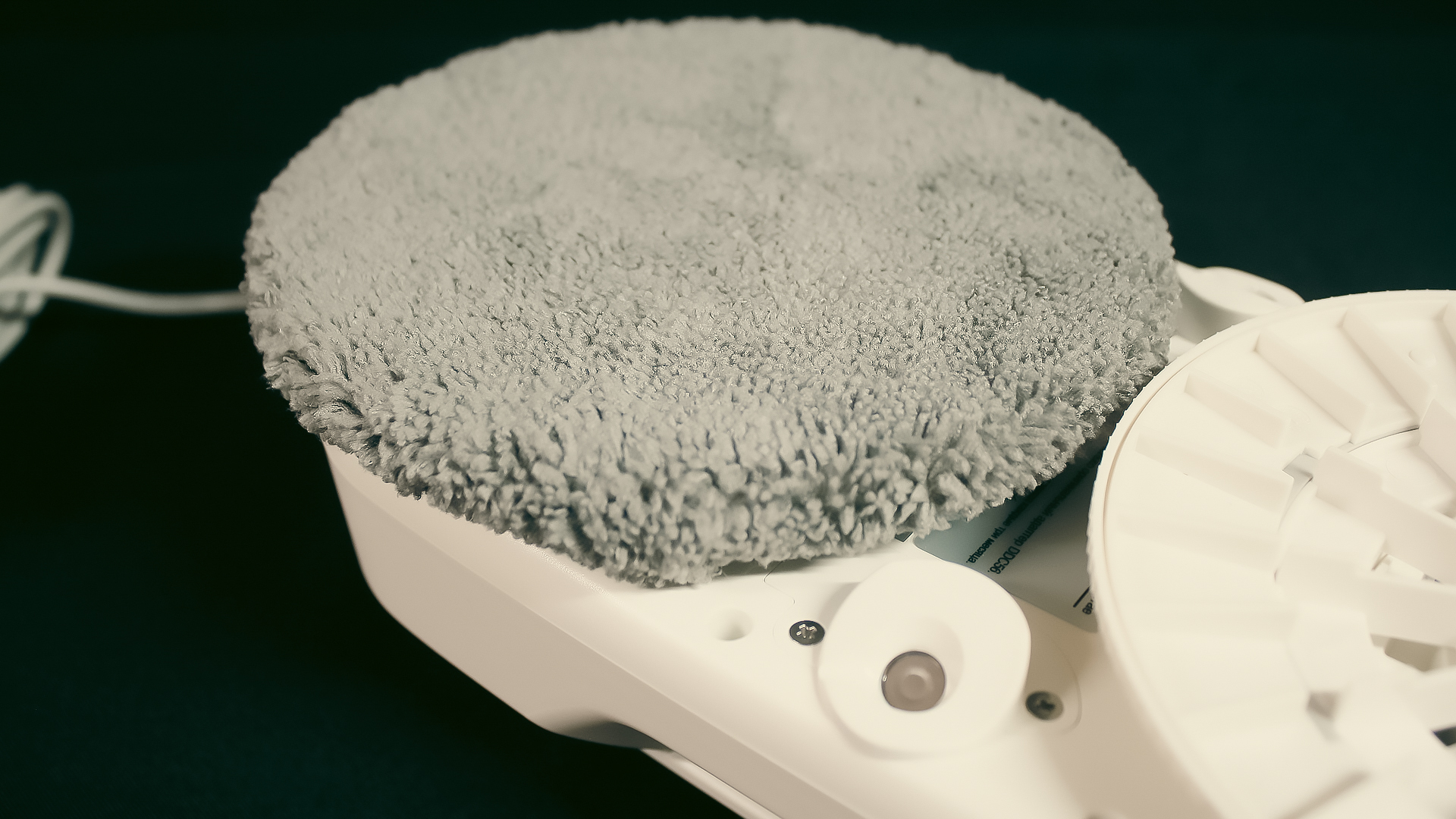 Возле дисков расположены распылители воды. Интересный момент: распылители работаю не одновременно, а поочередно. В зависимости от направления движения робота. Например, если робот двигает вправо – то работает правый распылитель в соответствии с направлением движения, и наоборот, левое движение – левый распылитель. Сделано это в целях экономии воды. Напомню, что резервуар в 60 мл способен обработать поверхность равную девяноста квадратным метрам.