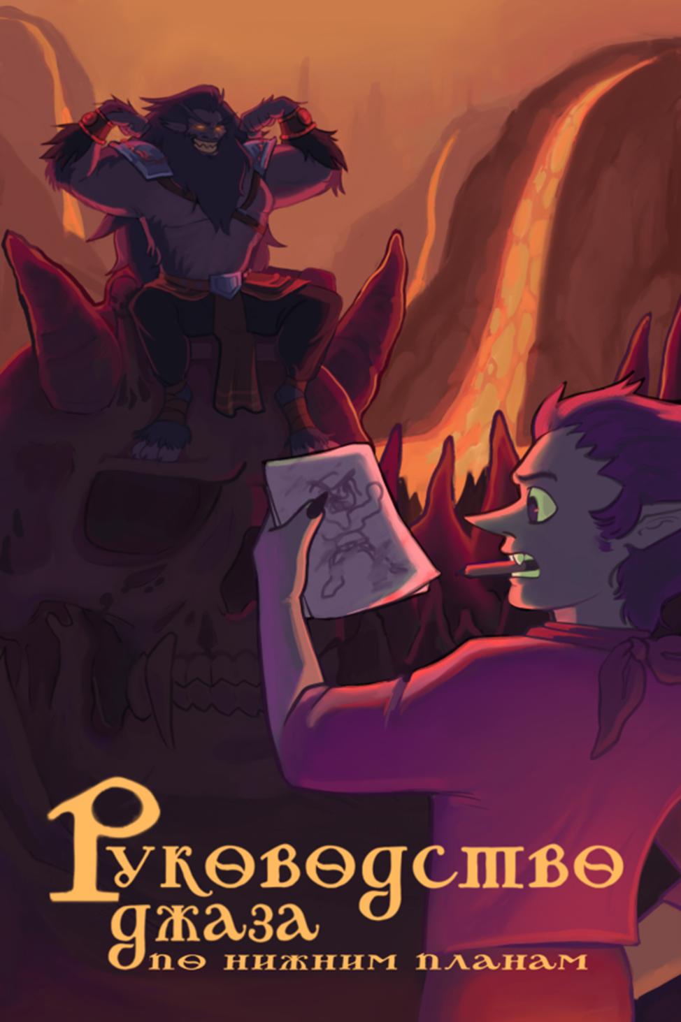 Багбир Джаз восседает на черепе мертвого лорда демонов, пока его друг и коллега гоблин-учёный Друп пытается нарисовать его.