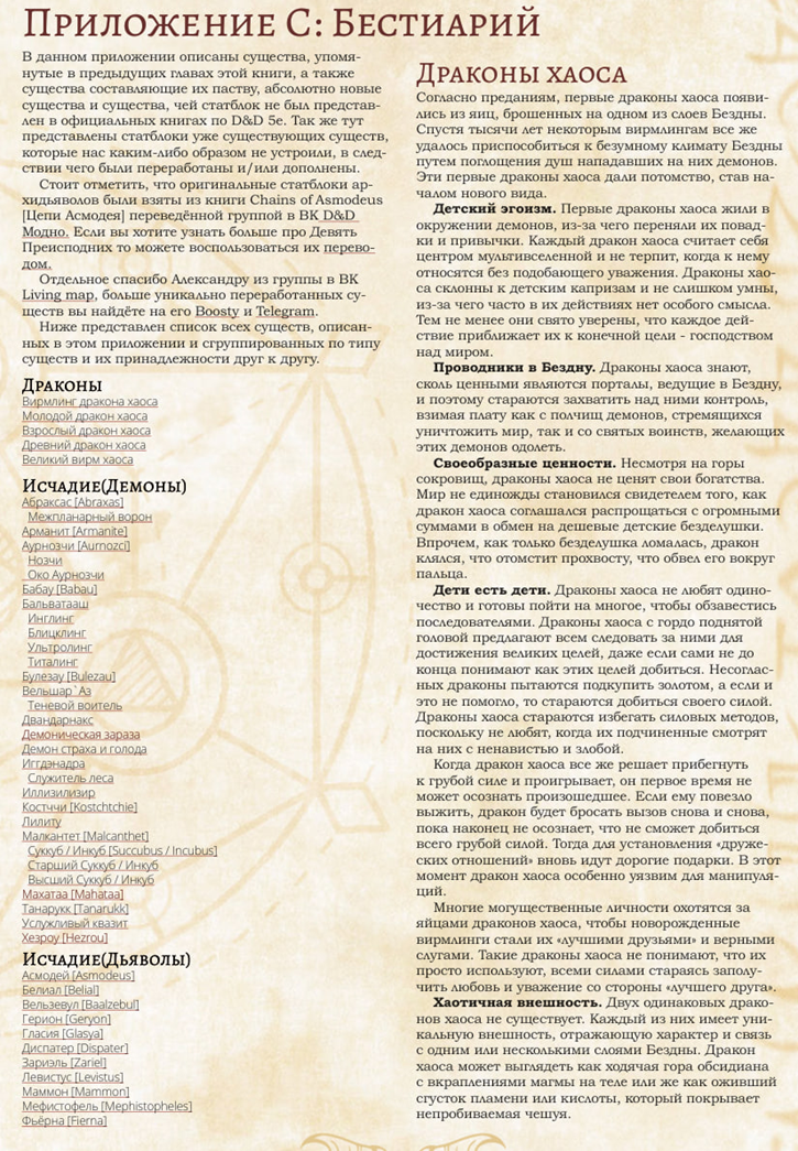 Ну и завершающая шестая глава - Бестиарий. Вас ждут новые и переработанные старые монстры, разумеется все они исчадия. Или не все? Вас ждут Драконы Хаоса, Ходячие Замки, вырывающие из себя целые башни с засевшими внутри демонами и швыряющие их во врагов, Обезумевшие Ростки Мирового Древа и Убитые горем Теневые Лорды, стремящиеся отомстить еще большему злу за свое унижение! Демоны страха и голода, новые виды суккубов, целые орды демонических абераций и их монструозный мозговитый предводитель, и много кто еще! Нижние Планы сплошь и рядом пропитаны безумием, ужасом и отчаянием - так насладитесь же этим букетом сполна! Ну а если вас не впечатлило все вышесказанное, предлагаю встретиться лицом к лицу с Лордами Девяти с Асмодеем во главе! Поверьте, вы еще нескоро забудете эту встречу.