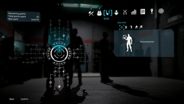 Как я уже сказал, у вашего персонажа есть скилы. Скилы эти делятся на два типа. Боевые скилы или способности и простые скилы или таланты. Боевые - это развитие трех веток вашего комбата (нож, щит или шест), в зависимости от того какой вам ближе. Плюс ветка, ответственная за применение магических способностей техномансера. Сами ветки делятся еще на подветки - в общем разгуляться есть где. Можно собрать достаточно большое количество разных билдов и это есть очень-очень хорошо. Очко способностей дается каждый уровень. По мере развития веток вы получаете новые возможности типа замедление времени, стрельба по нескольким целям и так далее. Таланты - это всякое умение складно разговаривать, знатно взламывать сундуки, четко прятаться, находить больше ништяков на трупах и так далее. Очки на развитие талантов выдается уже не так часто - раз в несколько уровней. Проблема только в том, что некоторые таланты типа стелса, не используются ровно никогда и нужны видимо просто для галочки. На самом деле о скилах я мог бы и не рассказывать, ибо в них нет абсолютно ничего, что опытный игрок в РПГ не видел бы. Ролевая система есть, она неплоха и на этом все. А ну у вас еще есть параметры - сила, ловкость и так далее, основное назначение которых это служить барьером для надевания тех или иных вещей. Тоже не фонтан креатива.