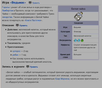 И последнее – существует зелье “Белая чайка”. Никаких эффектов у него нет, зачем оно нужно – в игре не написано (да, есть запись, что оно используется в качестве основы для ведьмачьих эликсиров, но это картины не проясняет), в сети я этого тоже не нашёл, поэтому хотелось бы сказать сразу: готовится оно из алкоголя минимального качества, а является лучшей основой, то есть это что то вроде полевого метода дистилляции. При наличии ингредиентов необходимых для приготовления, благо готовится она дёшево, рекомендую перегонять всё в неё для экономии места в инвентаре.