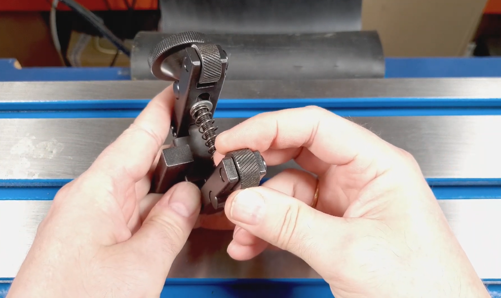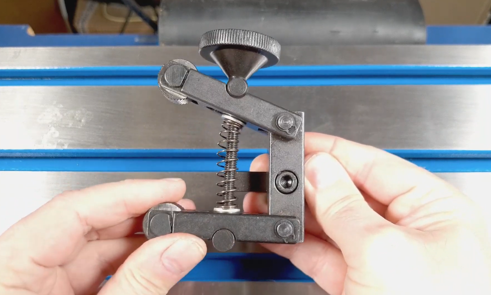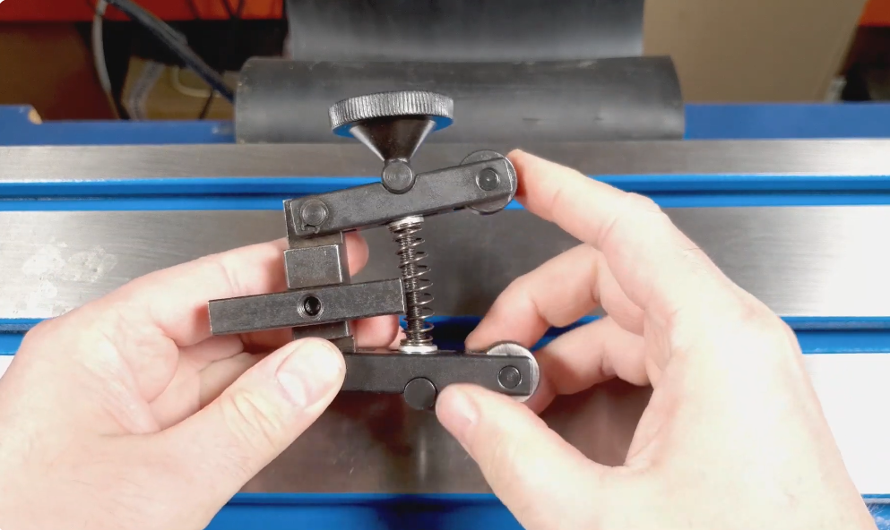 В данной накатке принцип совсем другой: она зажимает обрабатываемую деталь между двумя роликами, зажим которых обеспечивается винтом. При этом на станок не оказывается практически никаких усилий.