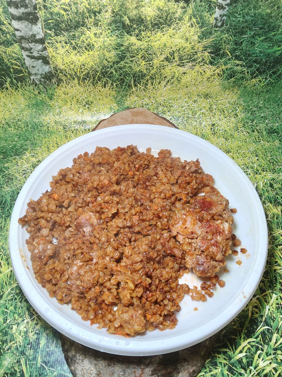 По цвету видно, что в блюдо плюхнули томатную пасту, мясо положили отдельным кусом, гречка такая же рассыпчатая, морковь добавлена. Именно томатная паста делает здесь вкус и уже не приходится жаловаться на пресность и тянуться к солонке.