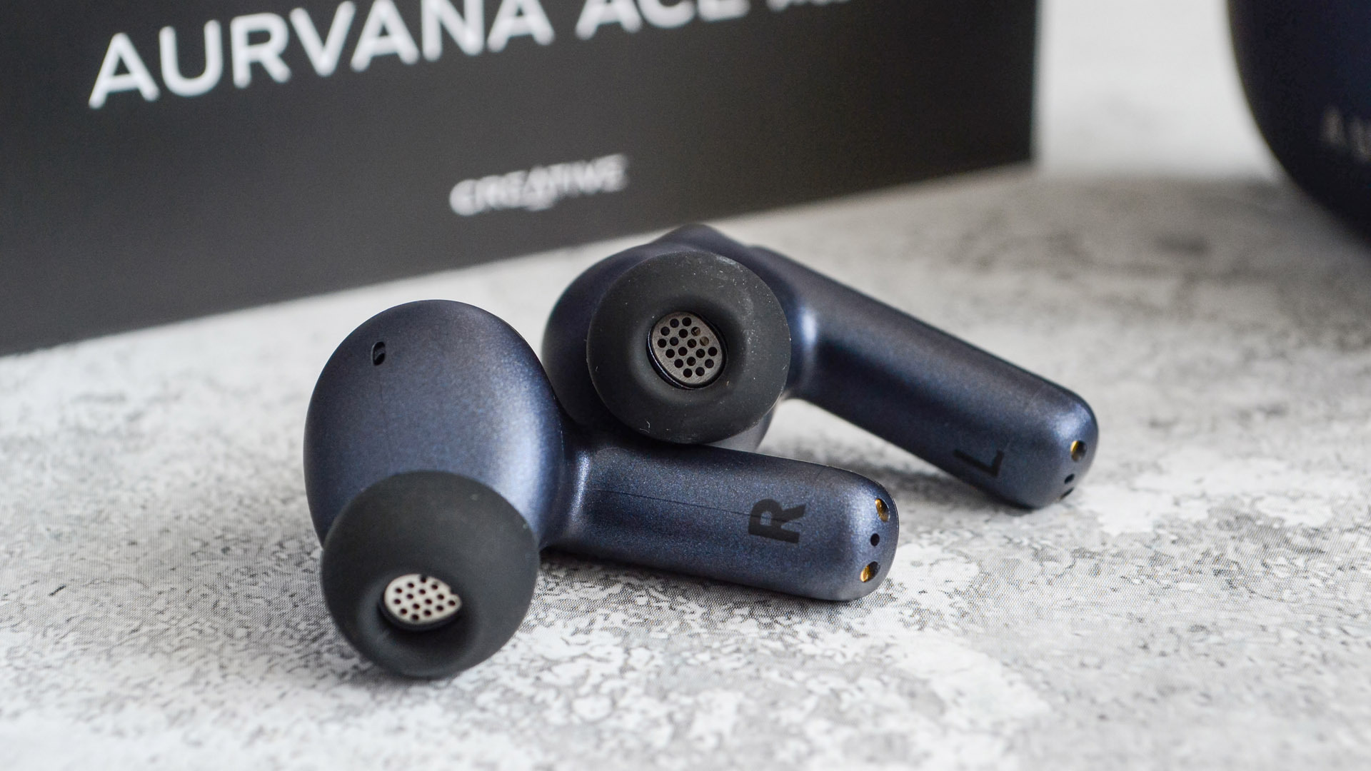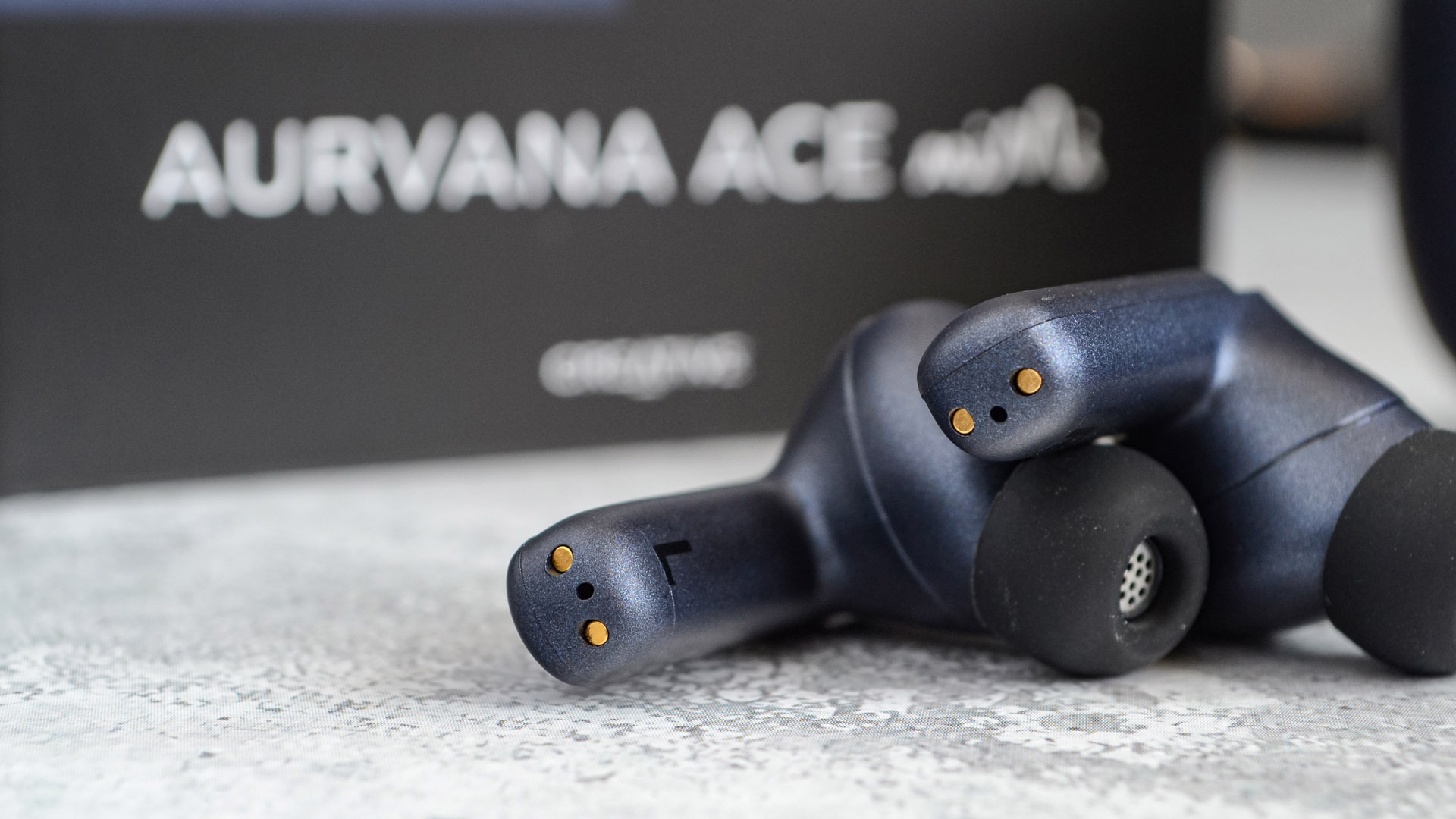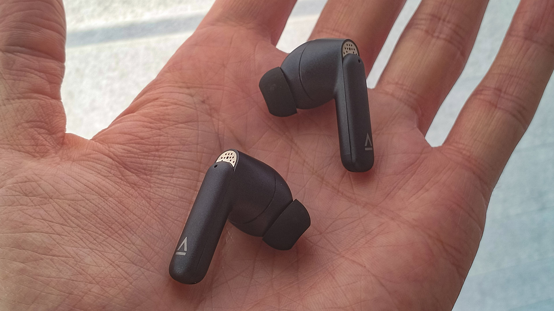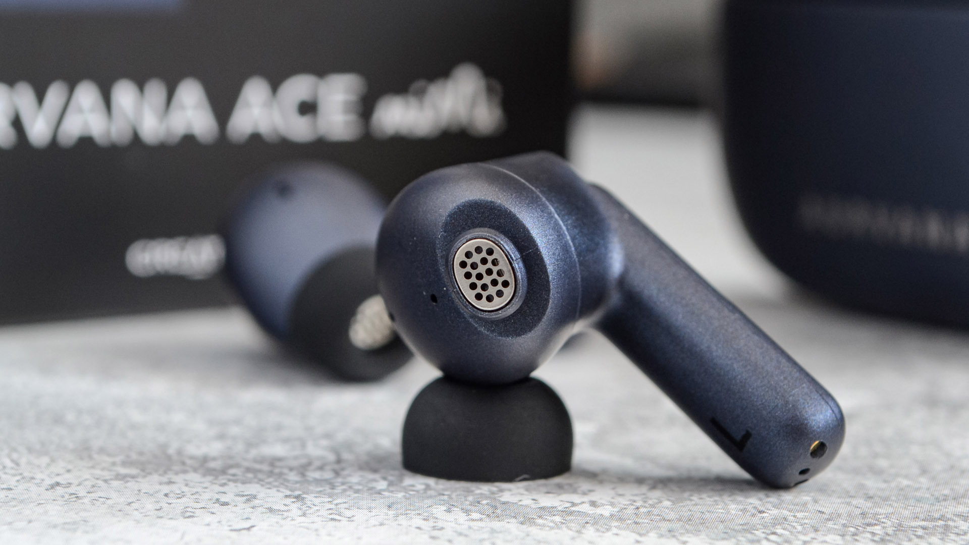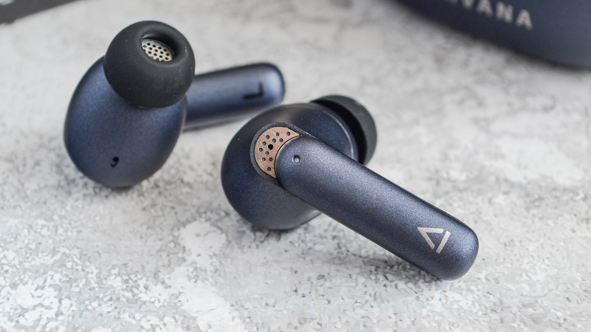 Итак, наушники — внутриканальные, с компактной «ножкой». Выполнены из такого же темно-синего пластика что и поверхность кейса. Конструкция элегантная, минималистичная, при этом отлично собрана.