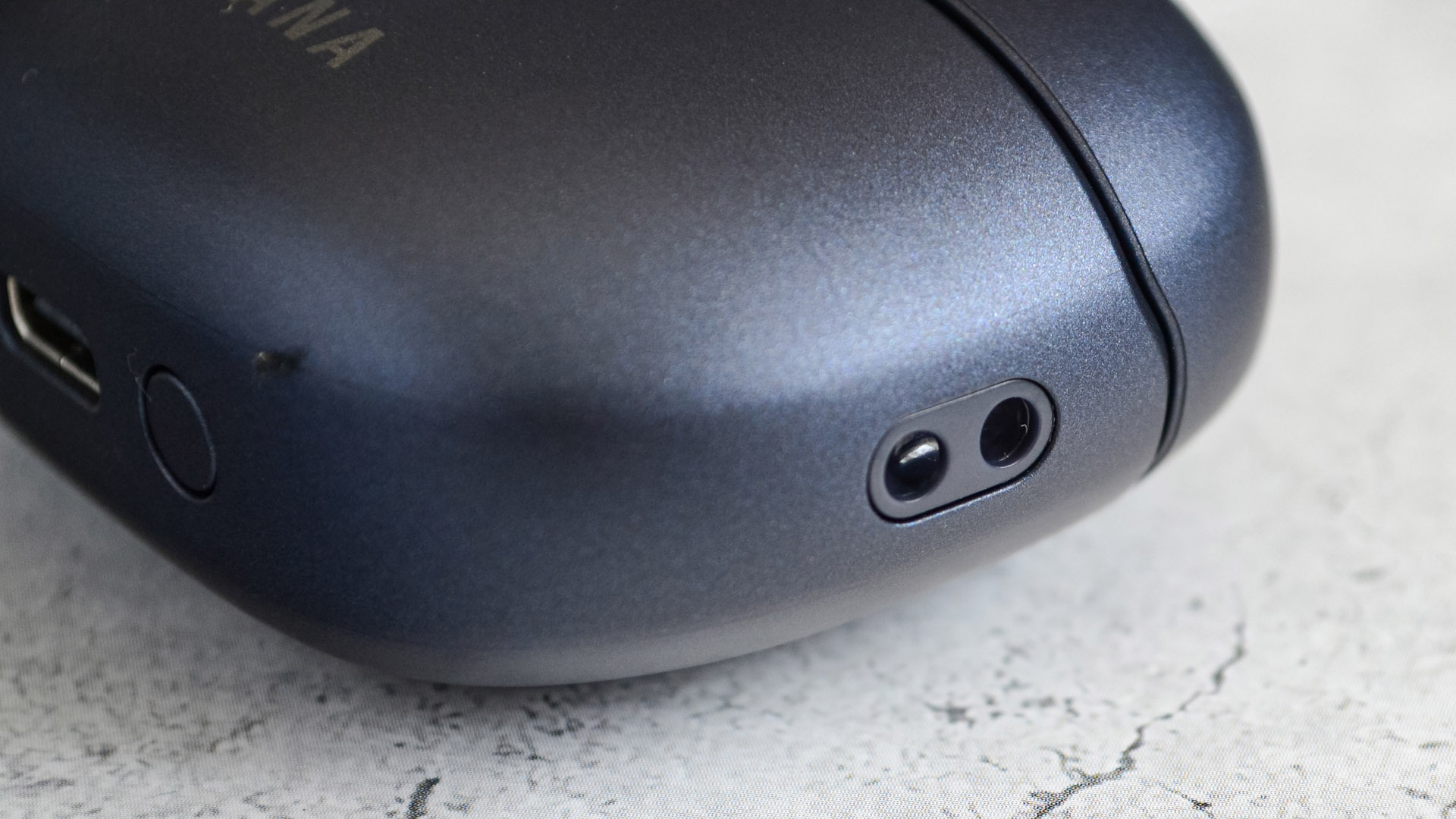 Снизу, на самом торце ножки, имеется пара зарядных контакта и отверстие еще одного микрофона. Обозначения «L» и «R» находятся на внутренней стороне.