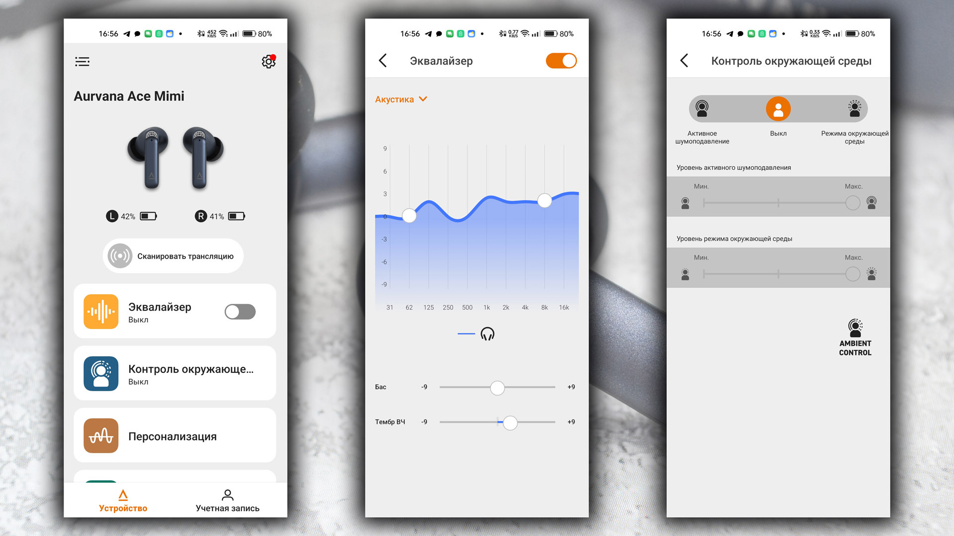 Приложение показывает уровень заряда каждого наушника по отдельности, позволяет настраивать сенсорное управление, использовать эквалайзер (выбирать из предложенных пресетов или создать собственный), а также управлять режимами ANC и его чувствительностью или отключать его.
