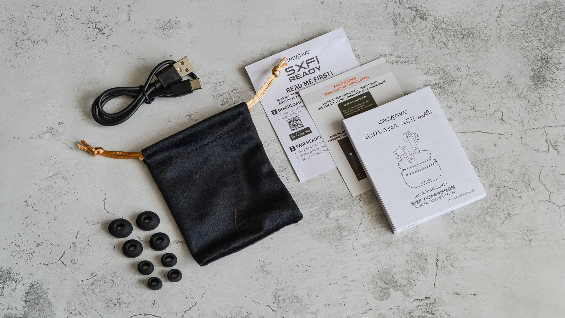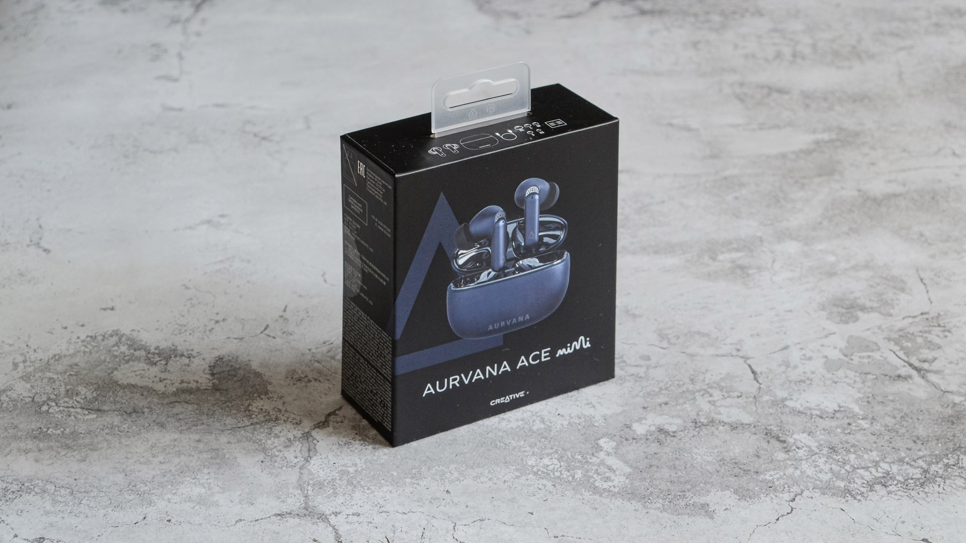 Creative Aurvana Ace Mimi поставляются в компактной коробке черного цвета, на лицевой стороне которой изображены сами наушники. Упаковка оформлена минималистично, но стильно — создается ощущение качественного продукта.