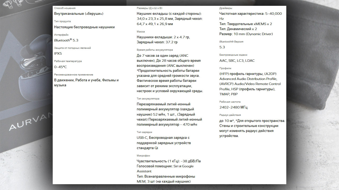В плане автономности Aurvana Ace Mimi показывают себя уверенно: около 6-6,5 часов на одном заряде с включённым ANC. Кейс даёт ещё несколько полных зарядок, что позволяет использовать их несколько дней без подзарядки.