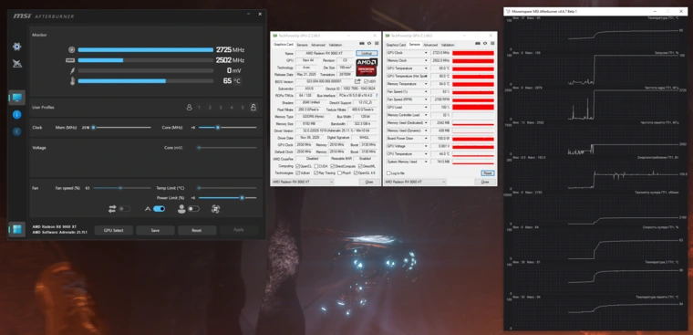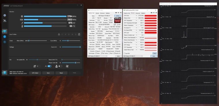 В играх и синтетических тестах видеокарта ASUS DUAL Rаdeоn RX 9060 XT бустит до 2750–2890 МГц в зависимости от нагруженности сцены и потребления. После нескольких минут температура устаканивается на отметке 65°C по графическому ядру, Hot Spot — 80°C, видеопамять — при 84°C. О подобных значениях мы поговорим в разделе «Дополнительные данные».