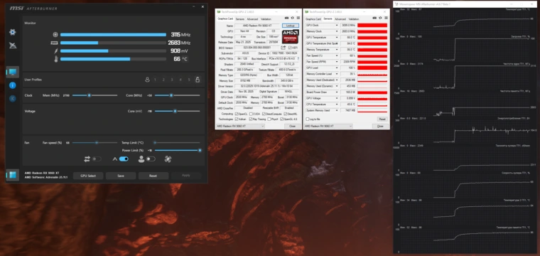 При разгоне видеокарт AMD последних поколений наблюдается парадоксальная ситуация: на увеличение напряжения чип не реагирует. Возможно, требуется чистая установка ОС. Однако если понижать напряжение, то частота ядра GPU автоматически растет вверх, что, возможно, является частью алгоритма Voltage Curve/Power Limit. По итогу мне удалось ASUS DUAL Rаdeоn RX 9060 XT разогнать по ядру до ~3100 МГц и видеопамяти — до 2700 МГц.