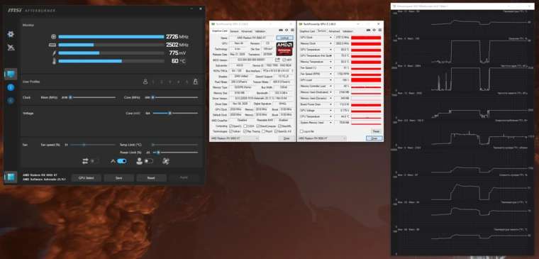 Видеокарту ASUS DUAL Rаdeоn RX 9060 XT можно охладить и через андервольтинг. Я пробовал настроить управление через оболочку драйвера AMD Radeon Software Adrenalin Edition и утилиту GPU Tweak III, но вернулся к MSI Afterburner.