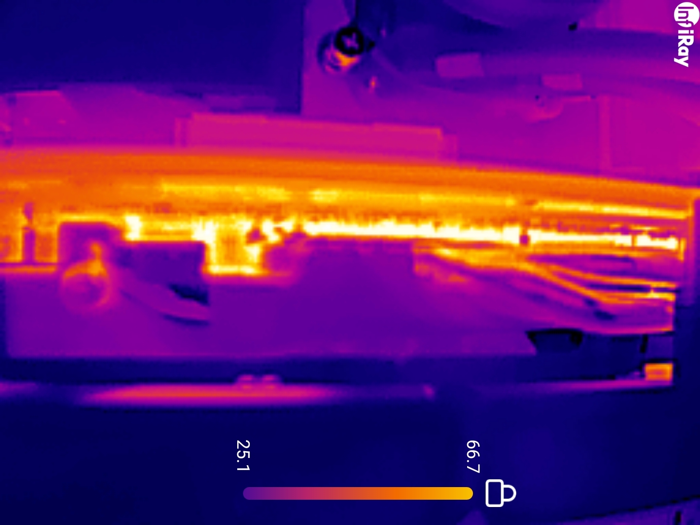 Добавил информацию с камеры тепловизора после 10 минут теста FurMark 2.0. Наиболее горячая зона отмечена в области графического процессора, а если быть точнее — вокруг него, то есть наиболее светлыми точками в местах расположения чипов видеопамяти.