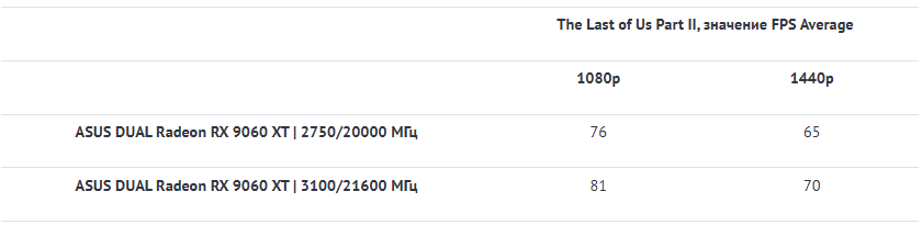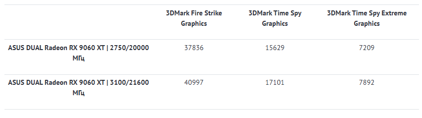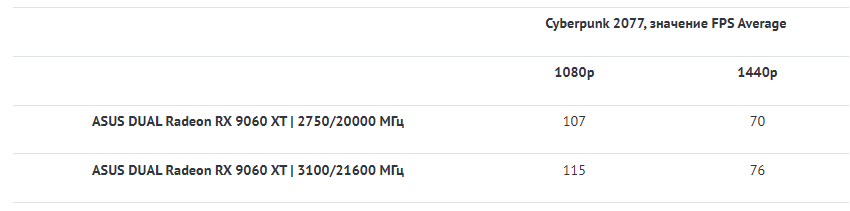 По итогу разгон видеокарты ASUS DUAL Radeon RX 9060 XT добавляет 8-10% производительности, а общие показатели превосходят GeForce RTX 5060.
