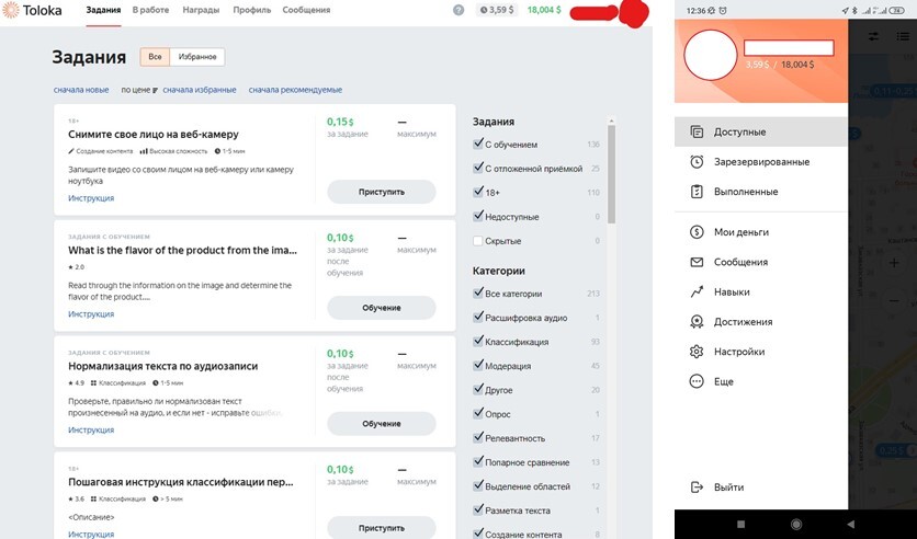 Кроме того, некоторые задания оплачиваются сразу, а некоторые бывают с отложенной приёмкой (все полевые, а также часть стационарных). Приём задания можно ожидать долго. В среднем, около 6 часов, но бывает и больше суток (задания принимают в т.ч. такие же участники Яндекс Толоки). На скринах можно увидеть, что у меня 18,004$ на счету и ещё 3,59$ ожидают подтверждения. За всё время у меня отклонили только одно задание (и я сам виноват, скинул мало фоток). Всё остальное оплачивалось в полном объёме. Иногда даже с бонусами. Бонусы выдавались, например, за фото внутри организации.