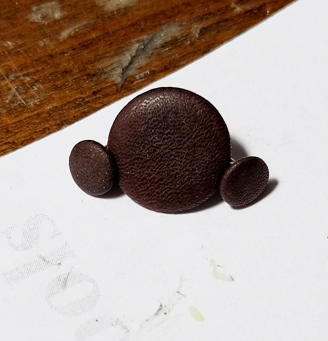 Вкладыш для носа будет крепиться на хольнитены. Поскольку мне не нравиться стальной блеск хольнитенов и кнопки, решил обтянуть их кожей. (Обтянутые кнопки я на Пикабу видел, а вот обтянутых хольнитенов что-то не припоминаю. Ну, что для себя не сделаешь. -))