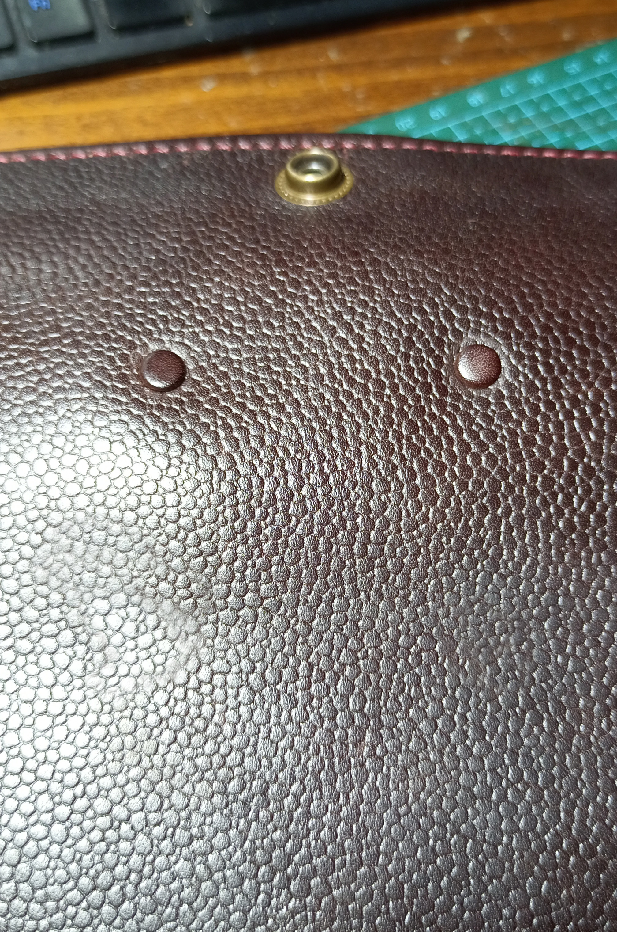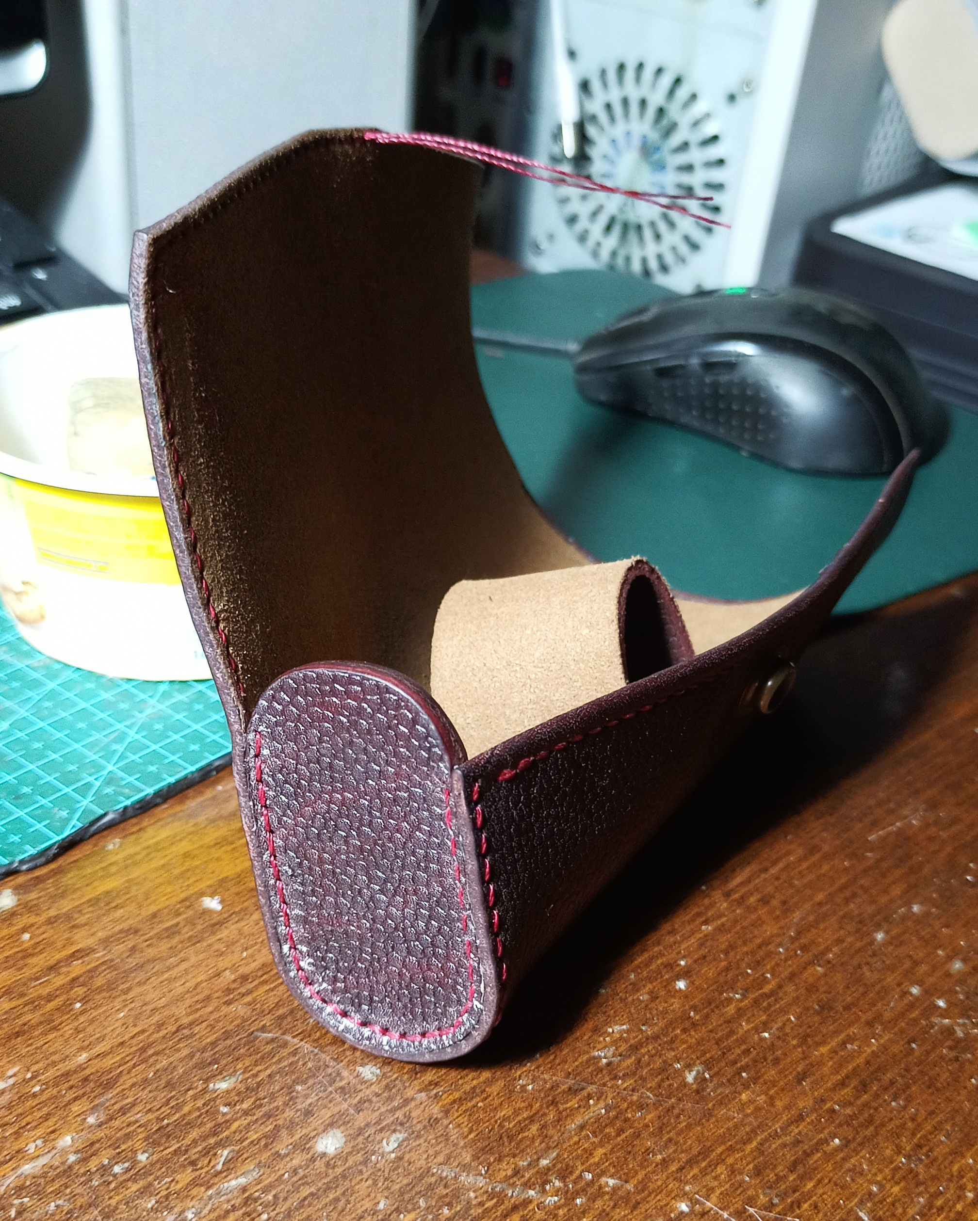 В местах крепления боковин подкладку подрезаю, устанавливаю кнопку и заклеиваю её подкладом. Урез будет "в загибку". Шерфую, гну, склеиваю, прошиваю.