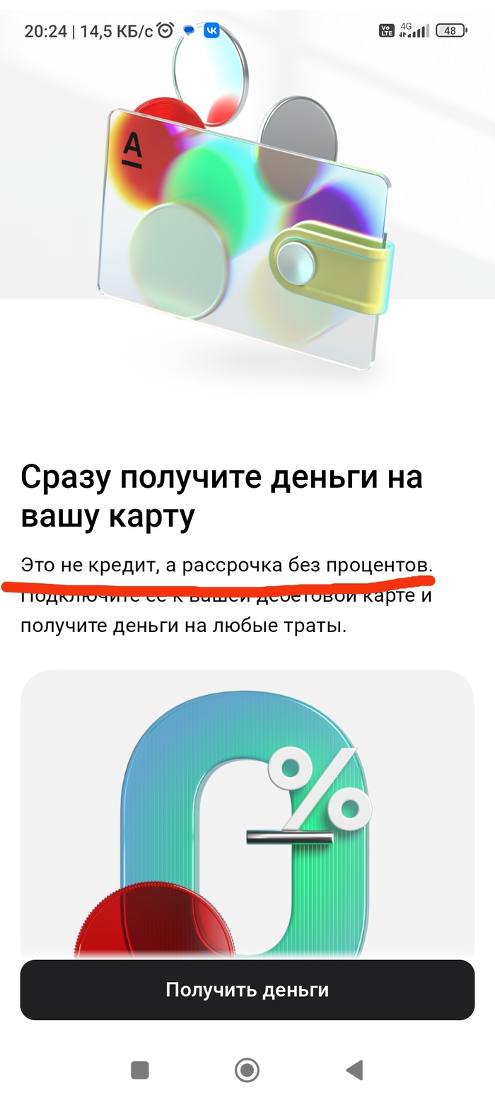 В приложении Альфы пришло уведомление о возможной рассрочке. Открываем ссылку...