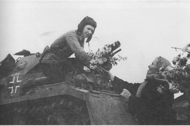 Здравствуйте Уважаемые читатели! Очень интересная фотография. Советский танкист принимает цветы на трофейном танке в Орджоникидзе (Владикавказ). Стоит отметить, что враг дошел до ближних подступов к Осетинской столице и был разгромлен в пригородном поселке Гизель в ноябре 1942. Фотография опубликована в Красной Звезде 5 декабря 1942. В завершение отмечу, темпы враг растерял ещё в сентябре 1942, в жарких боях под Малгобеком, где Клейсту противостояла 52-я тбр., причем очень удачно. А у меня все. Спасибо за внимание. До свидания!