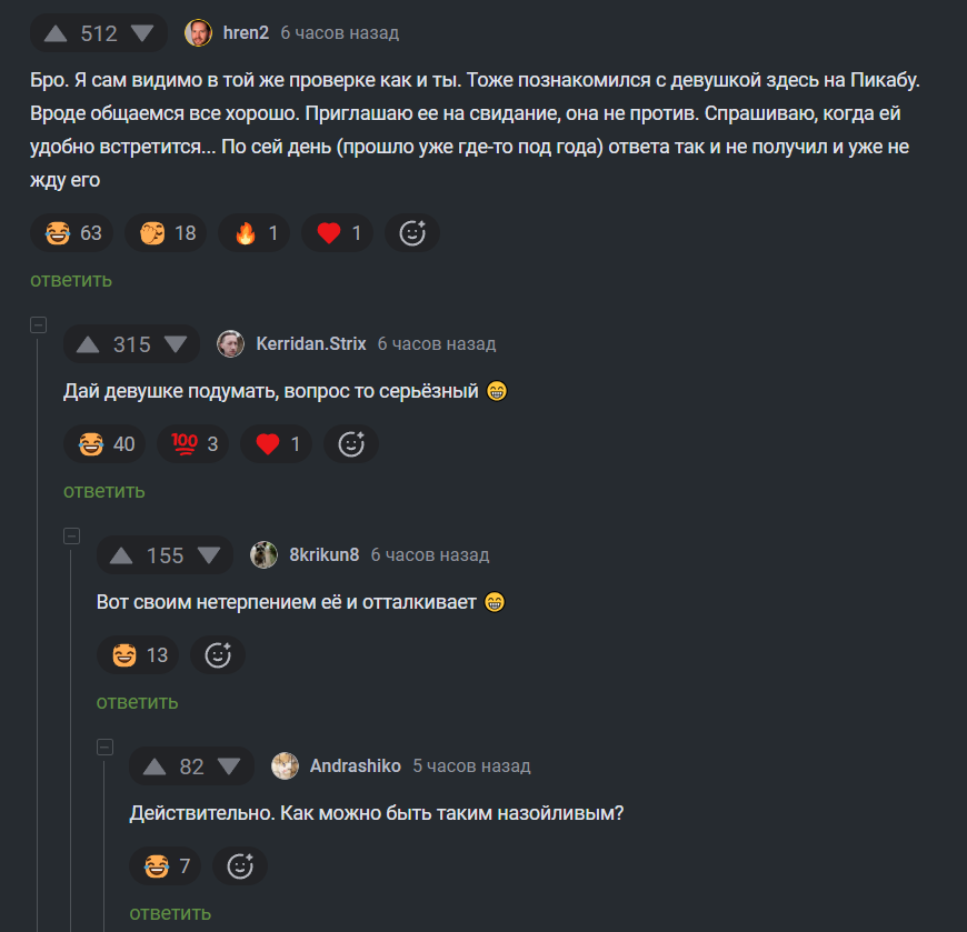 13 lllSETlll 16 дней назад Очень назойливый парень... #comment_371267440 @hren2, @Kerridan.Strix, @8krikun8, @Andrashiko Юмор Скриншот Комментарии на Пикабу Отношения Свидание 6 Ещё 0