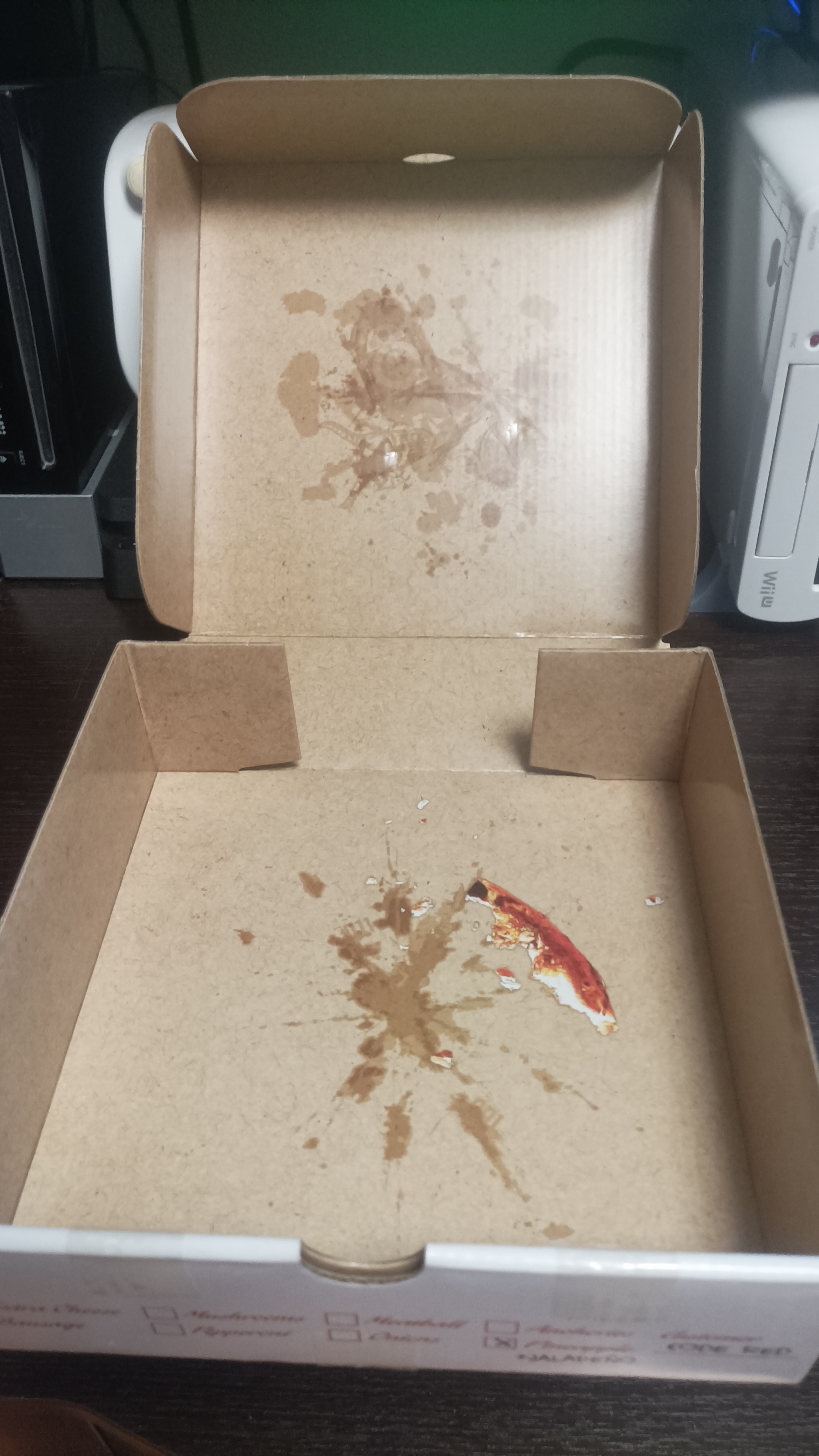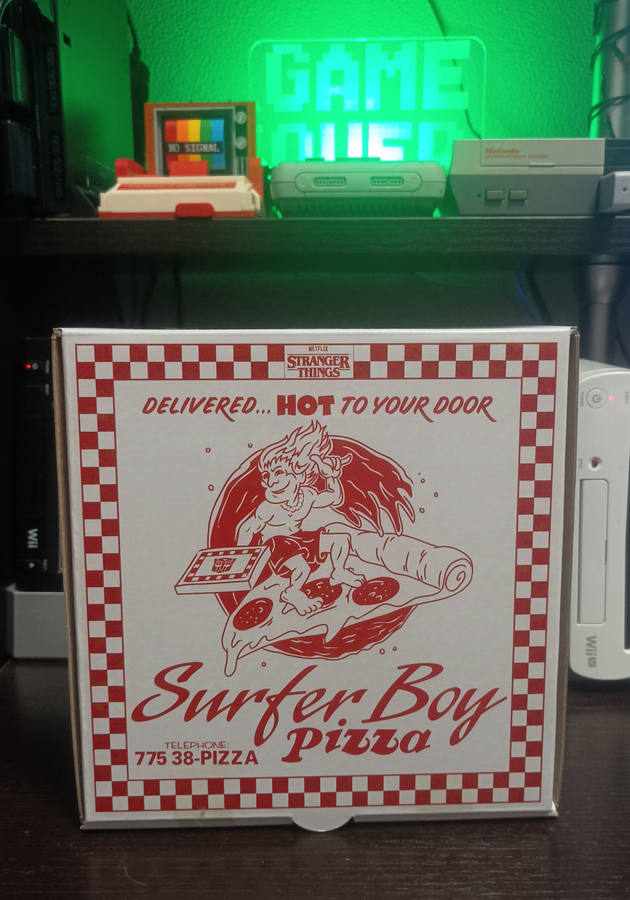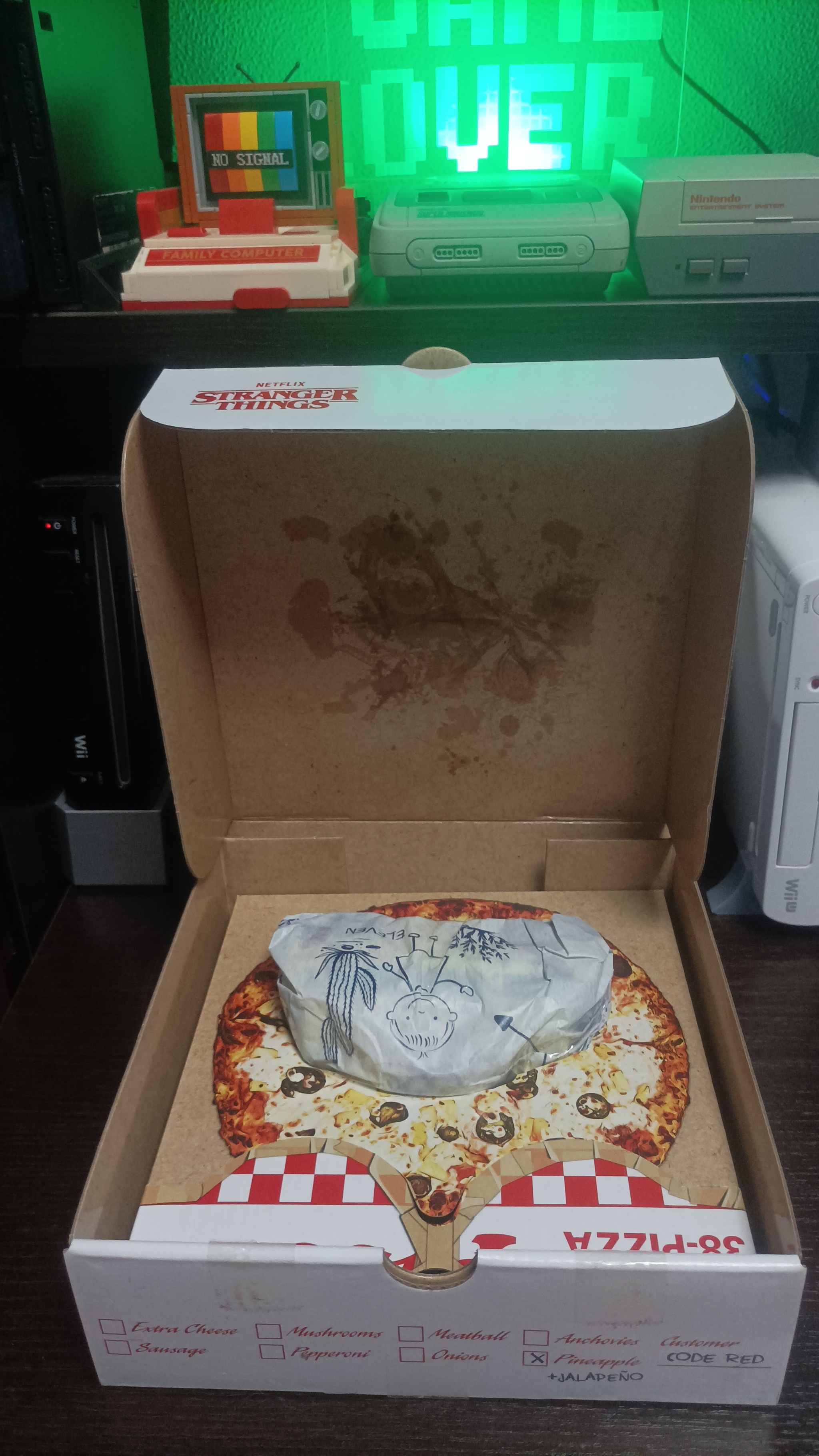 Упаковка сделана довольно прикольно, внутри коробка как из под пиццы, даже со следами жира на ней, естественно нарисованными.