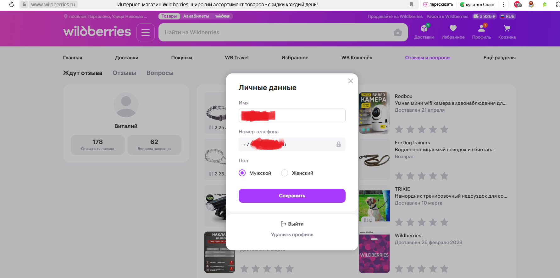Мой аккаунт, тут видна сумма в ВБ кошельке и номер (не весь конечно :-). Номер один в ВБ и на Госуслугах