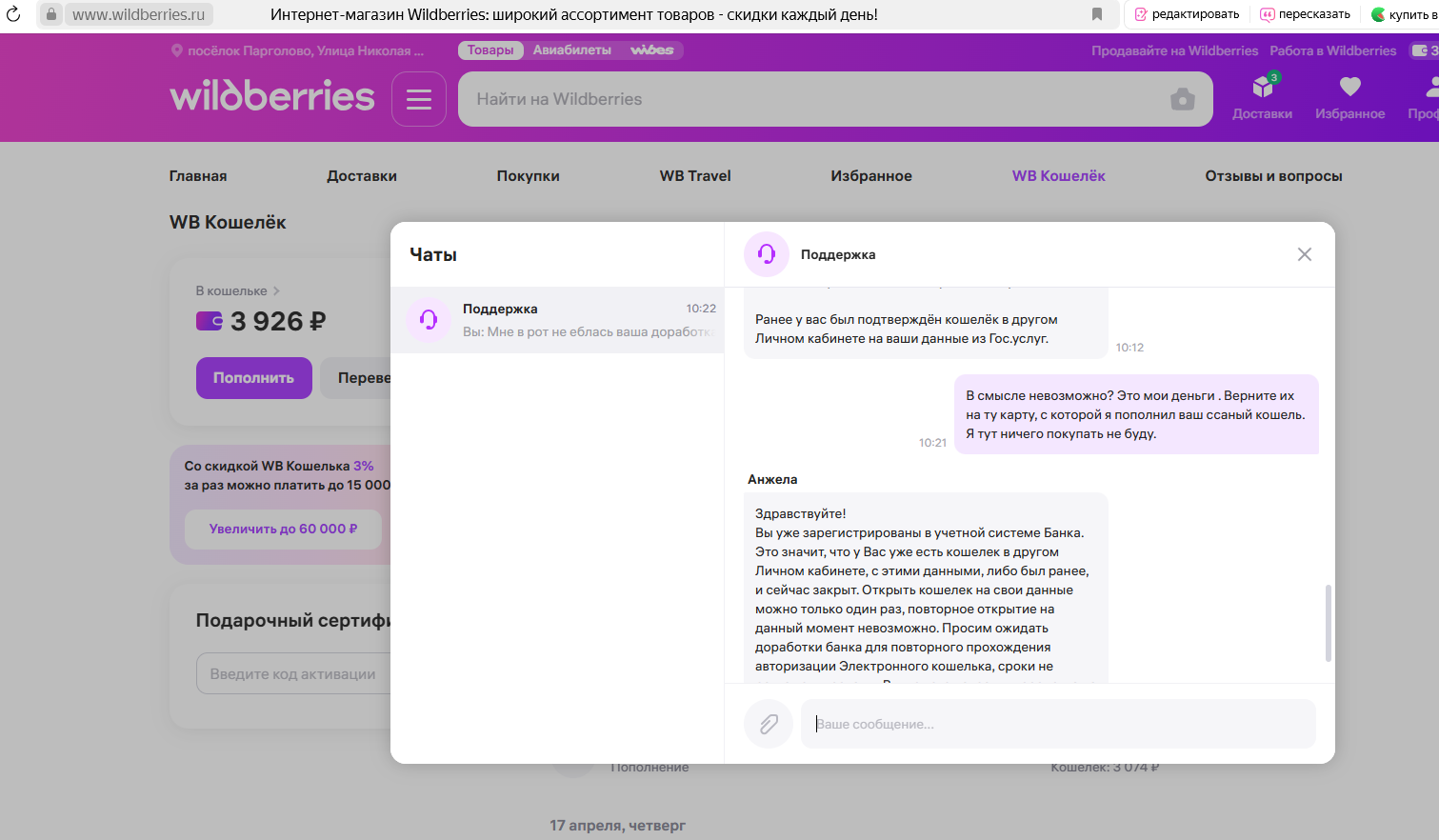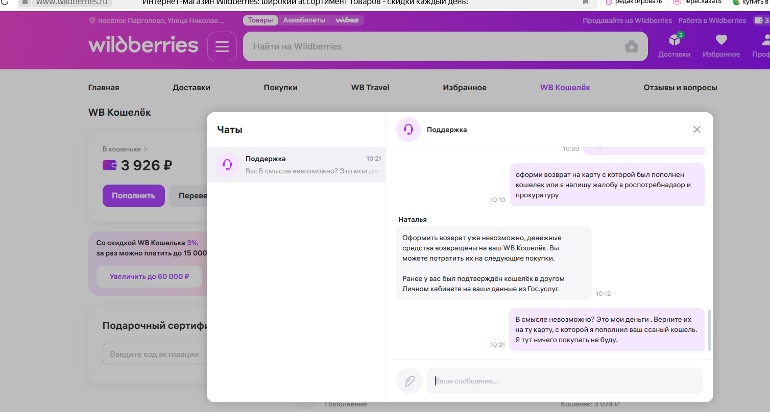 Факт навязывания WB Кошелька вместо возврата на карту.