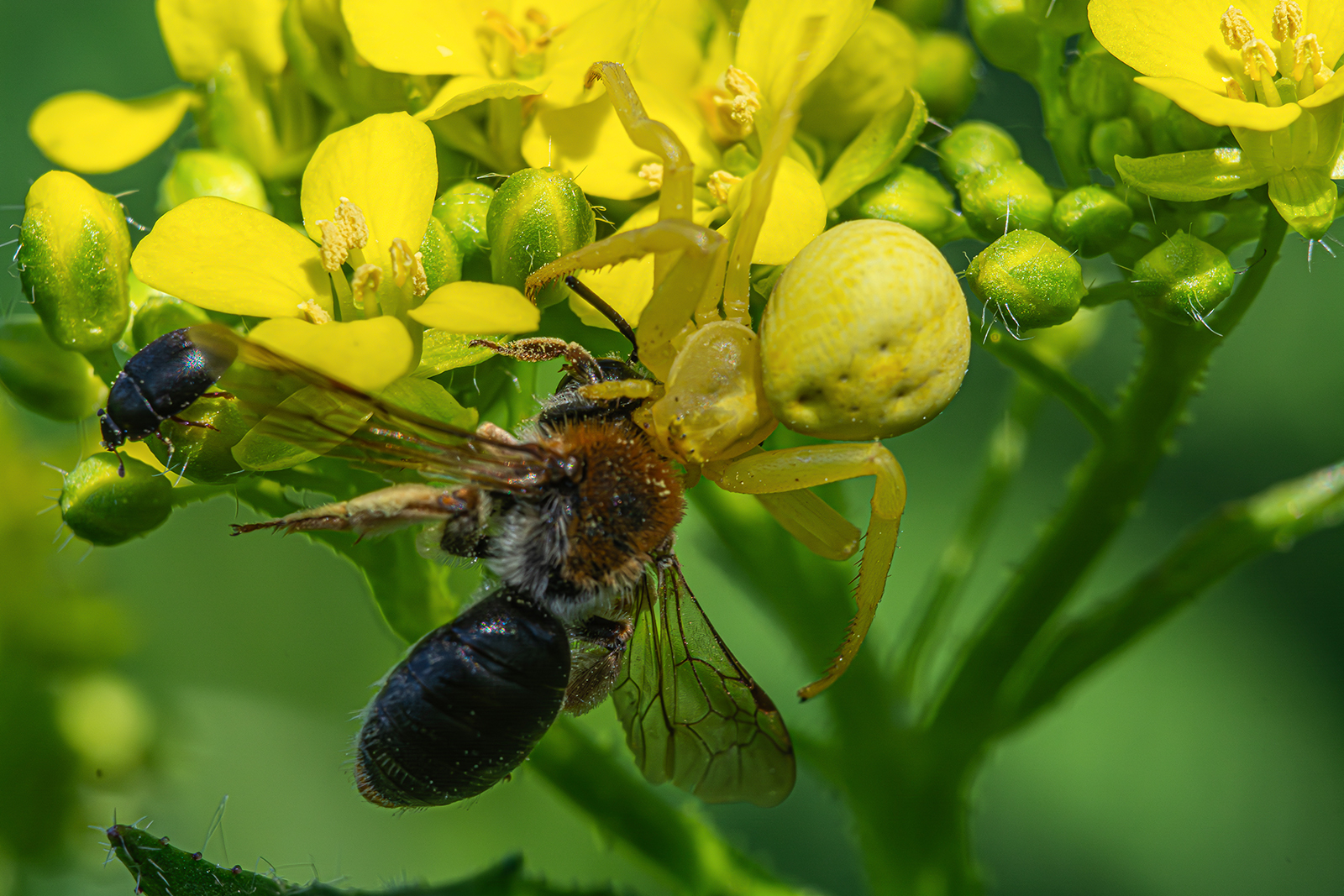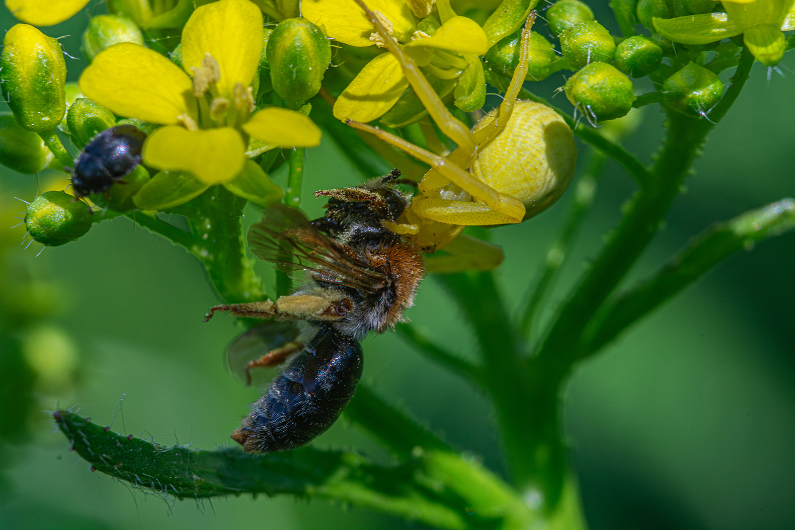 Обычно я этого паука вижу во вторую очередь. А в первую очередь вижу пчелу, которая совершает непонятные движения, т.е. просто сидит и не клюёт цветочек. Потом уже вижу паукообразную.