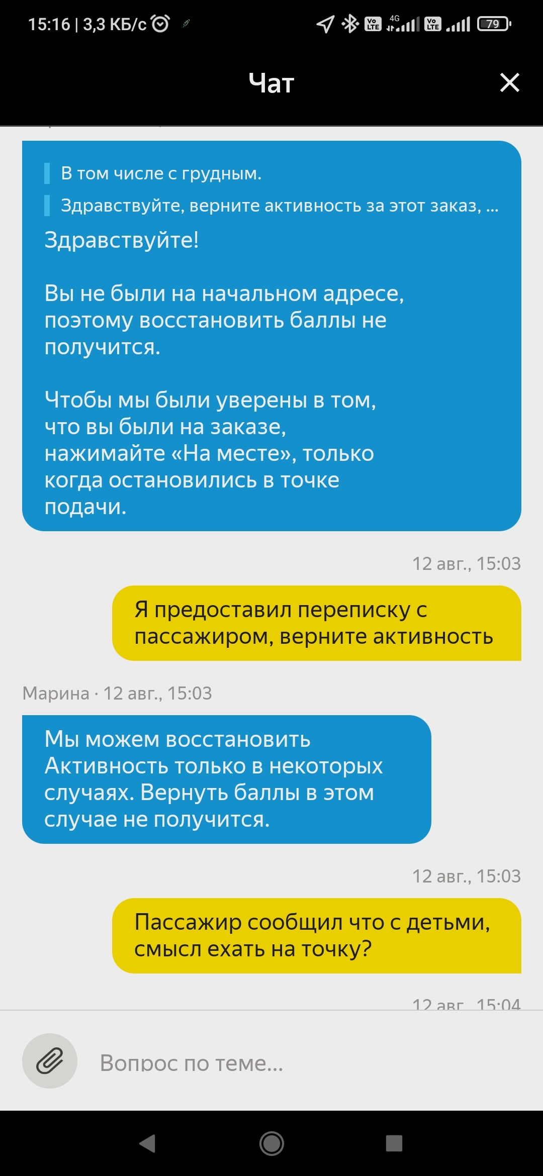 Сегодня прилетает заказ, пассажир с тремя детьми, пришлось отменить заказ, а в Яндексе при отмене заказа самим водителем снимается активность