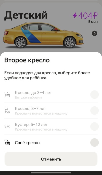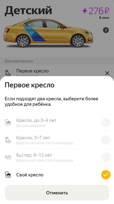 При попытке заказать машину с креслом зачастую приходится ждать до часа, иногда вообще не получается дождаться, когда обычно машина минут за 10 уже приезжает. Причем так у всех знакомых, обычно в результате перезаказывают без кресла и спокойно едут (у меня детей нет, не знаю как бы сам поступил).