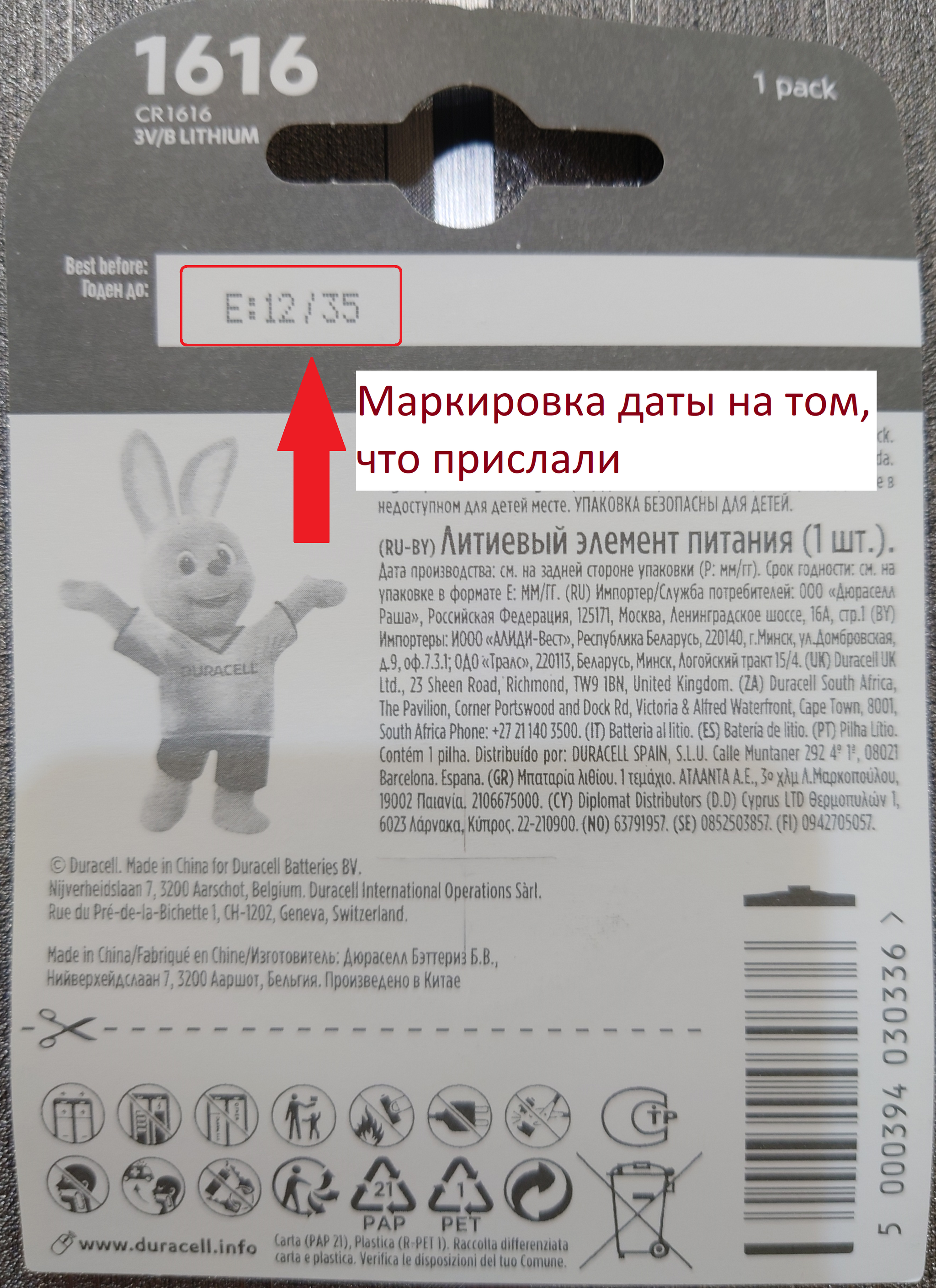 Порывшись в закромах достаём ещё тот самый, оригинальный Duracell из старых запасов (да, элементы в другом форм-факторе, но в целом такие же литиевые "таблетки") и что же мы видим: маркировка даты выпуска и срока годности кардинально отличается изобилием информации.