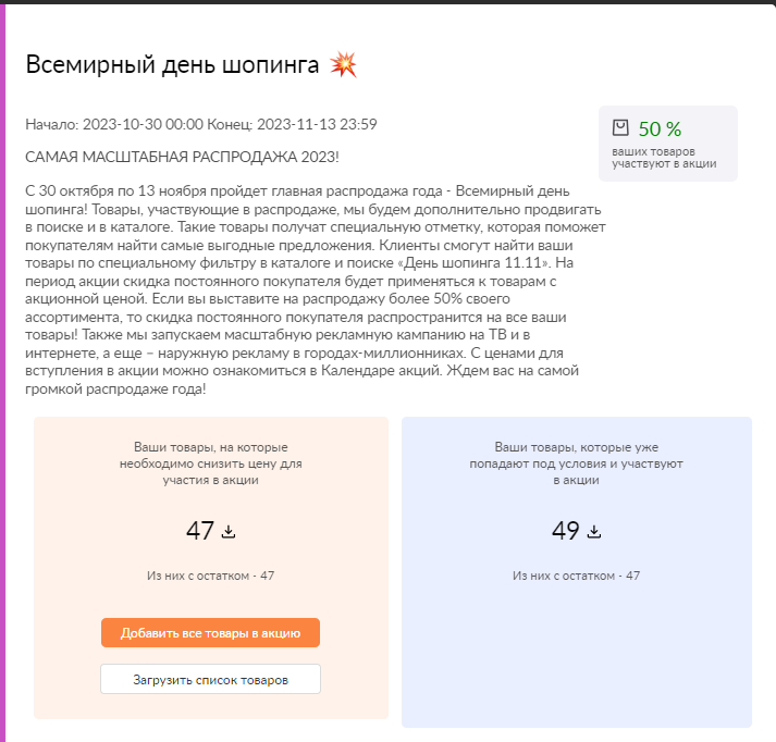 А теперь самая соль. Допустим у меня ровно 100 товаров и я добавляю в акцию 51 из них.