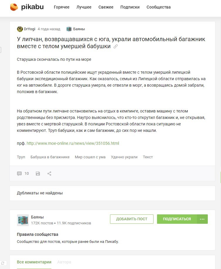 И чет таким душком от этой стори запахло, что аж вспомнилось, что в прошлый раз они они были не из Питера, а из Липецка У липчан, возвращавшихся с юга, украли автомобильный багажник вместе с телом умершей бабушки
