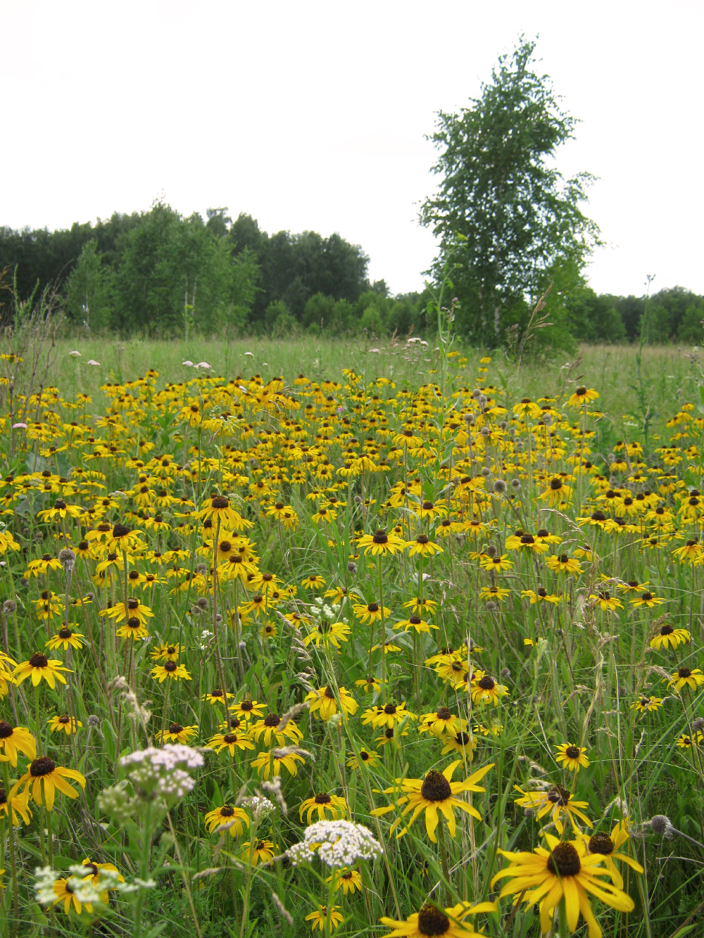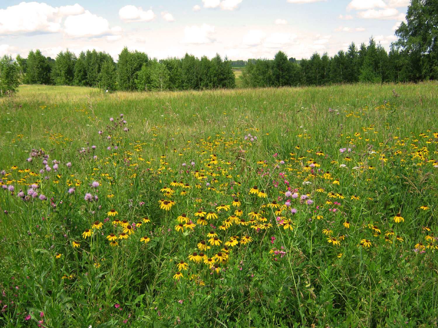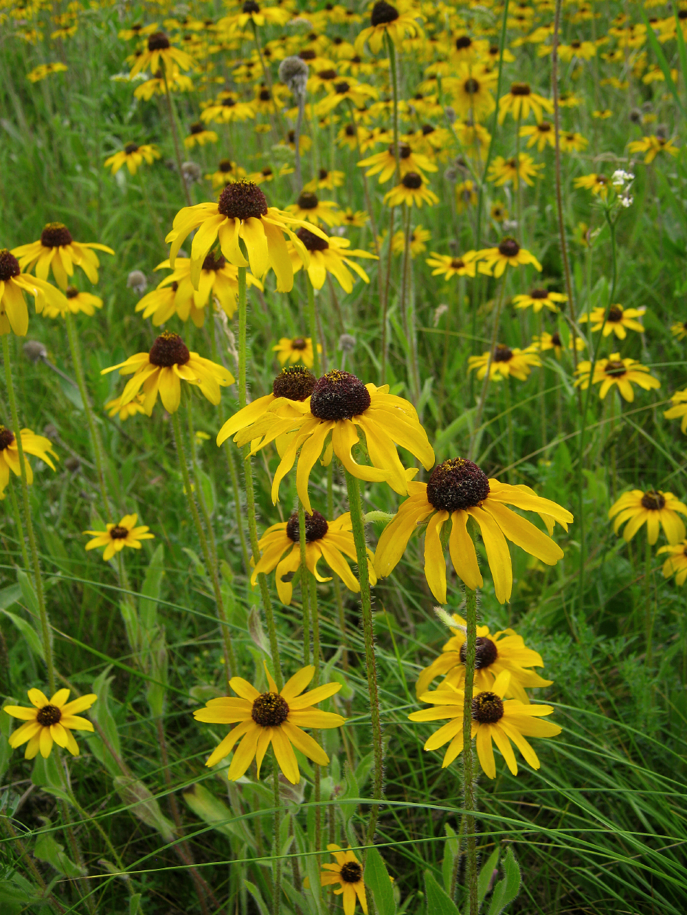 Рудбекия волосистая (Rudbeckia hirta) - растение из семейства астровых, родом из северной Америки. Была завезена в Россию как декоративное растение, но оказалось, что местные условия ей прекрасно подходят, потому она "сбежала" с клумб и начала распространение в дикой природе. Она устойчива к засухе и бедным почвам, а также склонна образовывать плотные заросли, за счет чего может вытеснять местные виды.
