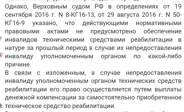 "Нельзя признать правильным и довод суда первой инстанции о том, что реализация права истца на получение технических средств реабилитации (подгузников) не может быть поставлена в зависимость от наличия или отсутствия достаточного финансирования расходов на приобретение технических средств реабилитации, поскольку в период, когда инвалид уполномоченным органом по каким-либо причинам, в том числе и по причине недостаточного финансирования, не был обеспечен техническими средствами реабилитации, предусмотренными индивидуальной программой реабилитации, его право на получение указанных мер социальной поддержки могло быть реализовано путём выплаты денежной компенсации за самостоятельно приобретённые технические средства реабилитации в порядке, установленном приказом Министерства здравоохранения и социального развития Российской Федерации от 31 января 2011 г. N 57н" (Конец цитаты) - Определение СК по гражданским делам Верховного Суда РФ от 28 ноября 2016 г. N 8-КГ16-22.