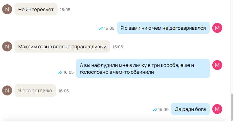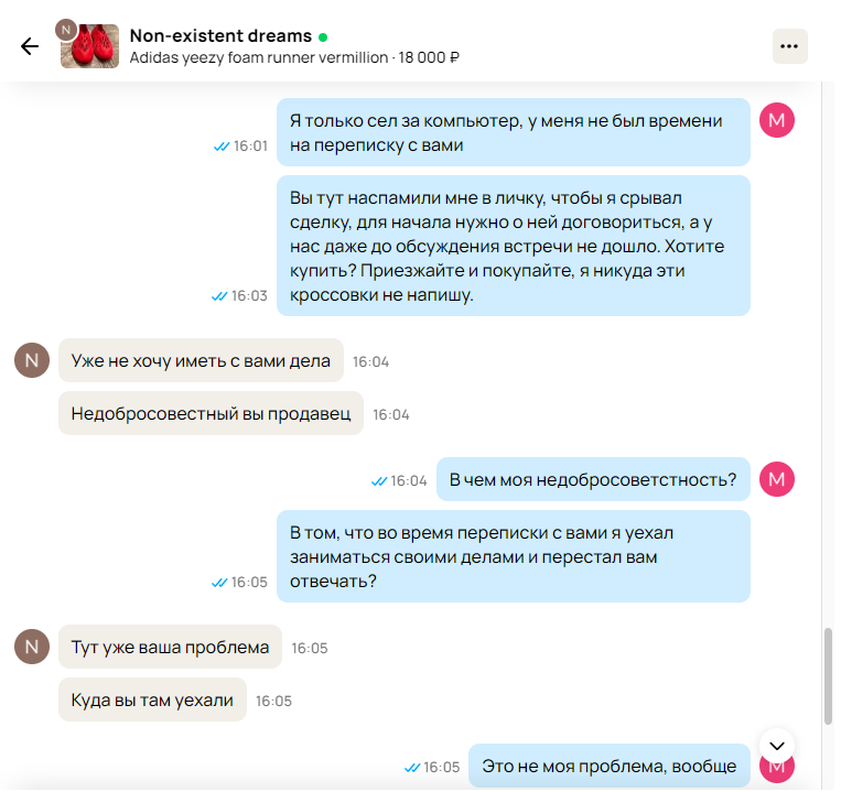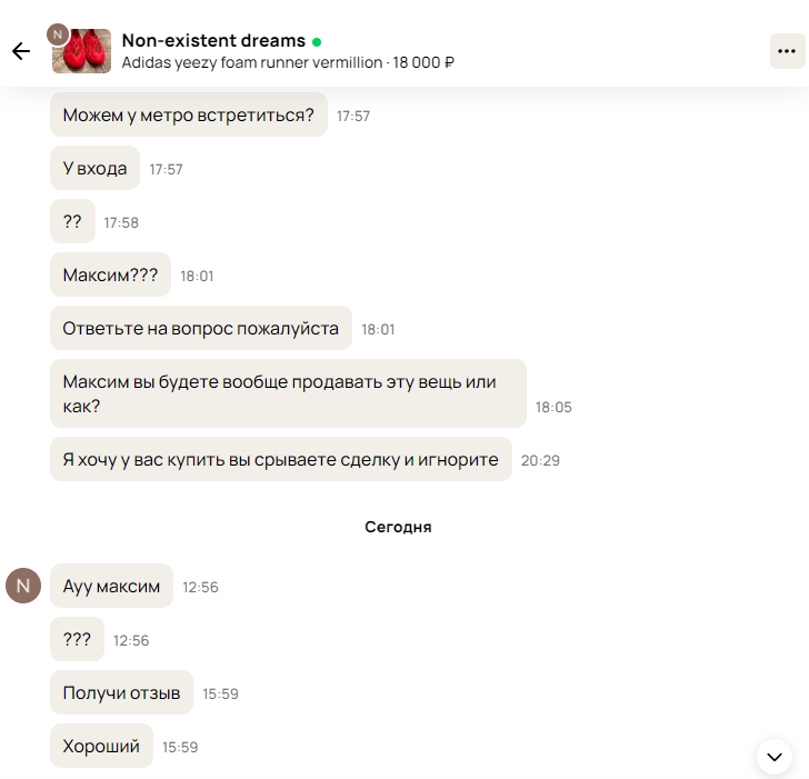Как оказалось данный человек продолжил писать мне весь вечер субботы и утром в воскресенье, обвиняя в игноре и в том, что сделка сорвалась, хотя мы ровным счетом ни о чем не договаривались. После того, как на следующий день включил компьютер, мне пришло уведомление в хроме о сообщении на авито, я зашел и увидел, что этот персонаж уже все для себя решил и настрочил обо мне гневный отзыв, я предложил ему встретиться, но он уже обидился. Ну ок.