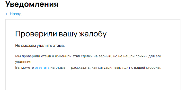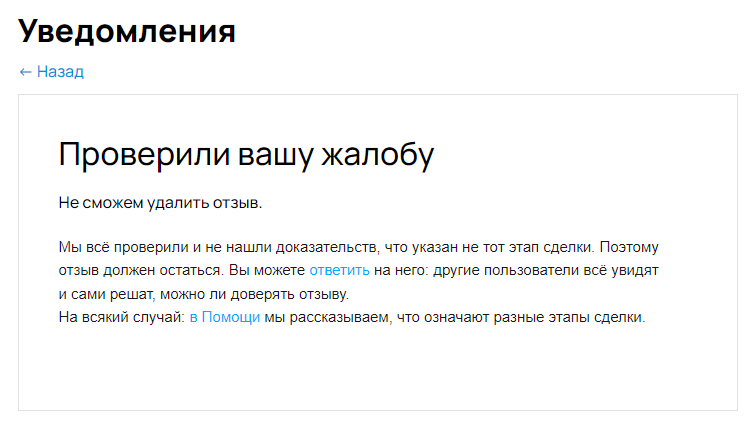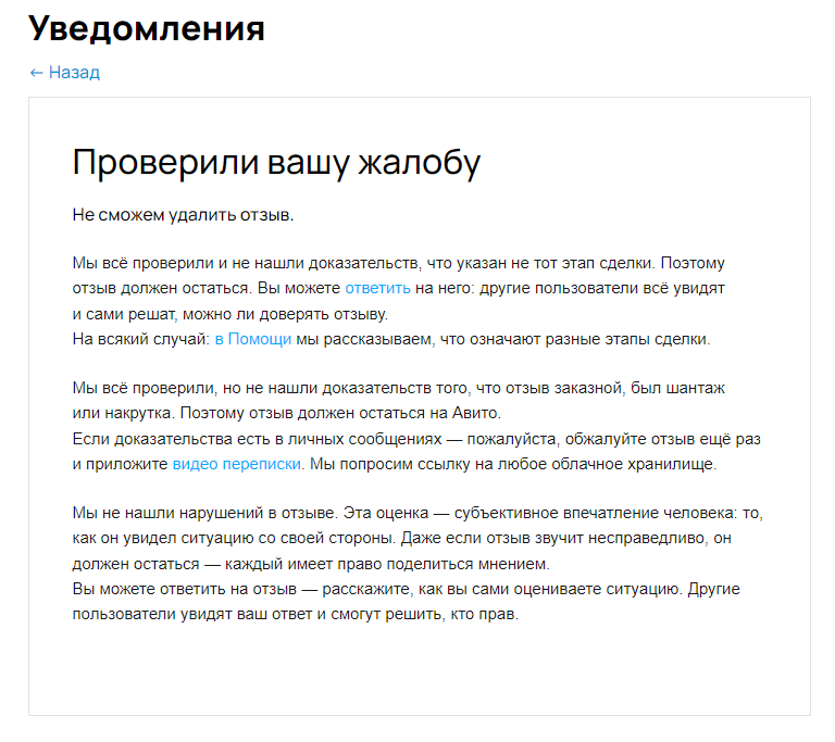 Таких отписок было две, на обоих одинаковый текст, когда персонаж оставил отзыв в третий раз и я в третий раз обжаловал отзыв, видимо у авито что то сломалось и оказалось, что все было правильно, ниже два скрина на две моих жалобы, третью и четвертую.