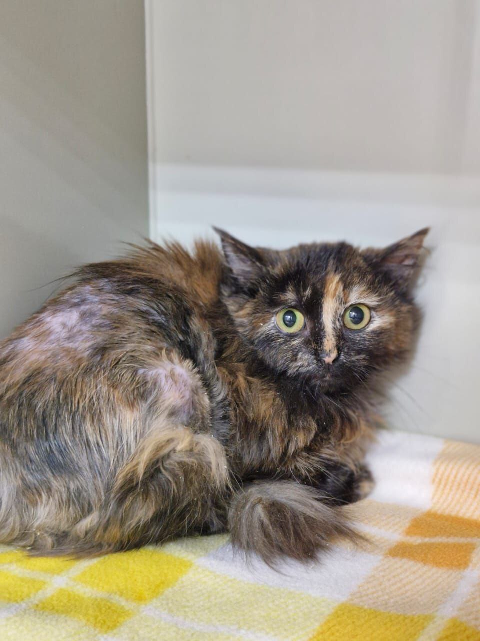 Девочка очень сильно стрессует, когда к ней подходят. Но главное, что аппетит у неё хороший. Это добрый признак. В общем надеемся и верим, что она идёт на поправку. Уже какой день нет ухудшения состояния, тьфу-тьфу-тьфу. Это явно добрый знак.